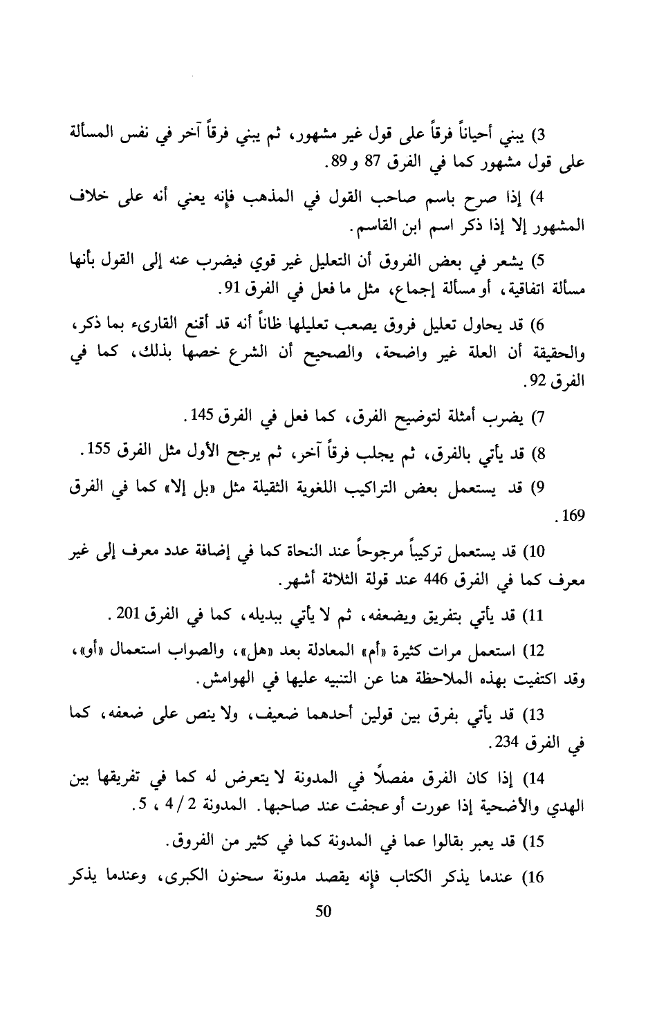 13) قد يأتي بفرق بين قولين أحدهما ضعيف، ولا ينص على ضعفه، كما في الفرق 234.