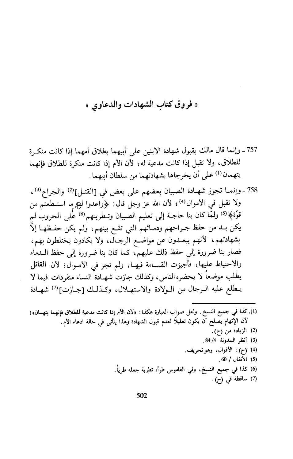758 - وإنما تجوز شهادة الصبيان بعضهم على بعض في [القتل] (¬2) والجراح (¬3)، ولا تقبل في الأموال (¬4)؛ لأن الله عزَّ وجلَّ قال: {وَأَعِدُّوا لَهُمْ مَا اسْتَطَعْتُمْ مِنْ قُوَّةٍ} (¬5) ولما كان بنا حاجة إلى تعليم الصبيان وتطريتهم (¬6) على الحروب لم يكن بد من حفظ جراحهم ودمائهم التي تقع بينهم، ولم يكن حفظها إلَّا بشهادتهم، لأنهم يبعدون عن مواضع الرجال، ولا يكادون يختلطون بهم، فصار بنا ضرورة إلى حفظ ذلك عليهم، كما كان بنا ضرورة إلى حفظ الدماء والاحتياط عليها، فأجيزت القسامة فيها، ولم تجز في الأموال؛ لأن القاتل يطلب موضعًا لا يحضره الناس، وكذلك جازت شهادة النساء منفردات فيما لا يطلع عليه الرجال من الولادة والاستهلال، وكذلك [جازت] (¬7) شهادة