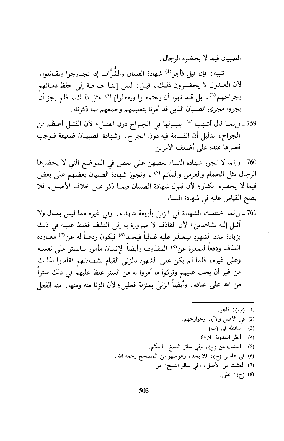 760 - وإنما لا تجوز شهادة النساء بعضهن على بعض في المواضع التي لا يحضرها الرجال مثل الحمام والعرس والمآتم (¬5)، وتجوز شهادة الصبيان بعضهم على بعض فيما لا يحضره الكبار؛ لأن قبول شهادة الصبيان فيما ذكر عل خلاف الأصل، فلا يصح القياس عليه في شهادة النساء.