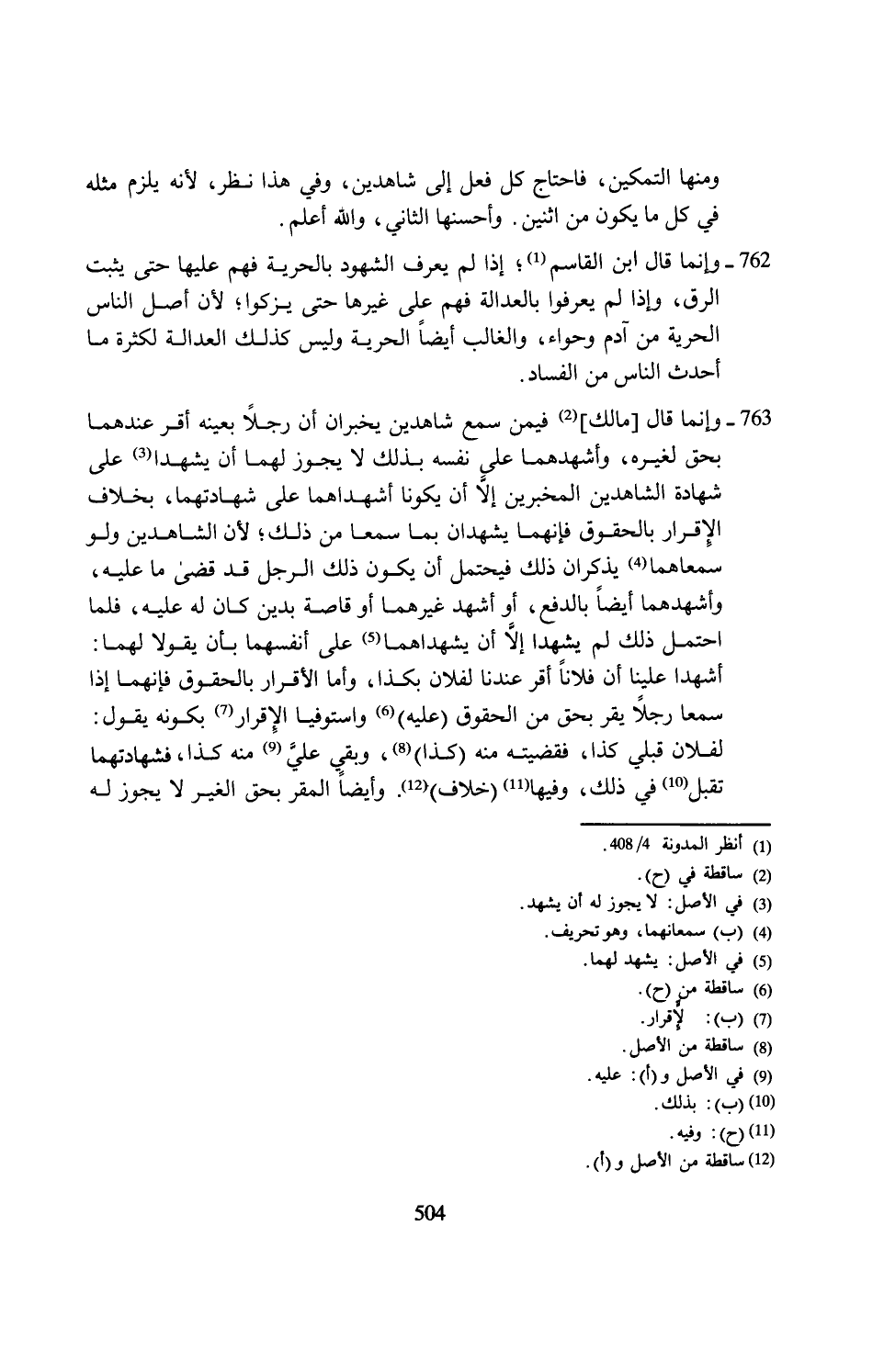 763 - وإنما قال [مالك] (¬2) فيمن سمع شاهدين يخبران أن رجلًا بعينه أقر عندهما بحق لغيره، وأشهدهما على نفسه بذلك لا يجوز لهما أن يشهدا (¬3) على شهادة الشاهدين المخبرين إلَّا أن يكونا أشهداهما على شهادتهما، بخلاف الإِقرار بالحقوق فإنهما يشهدان بما سمعا من ذلك؛ لأن الشاهدين ولو سمعاهما (¬4) يذكران ذلك فيحتمل أن يكون ذلك الرجل قد قضى ما عليه، وأشهدهما أيضًا بالدفع، أو أشهد غيرهما أو قاصة بدين كان له عليه، فلما احتمل ذلك لم يشهدا إلَّا أن يشهداهما (¬5) على أنفسهما بأن يقولا لهما: أشهدا علينا أن فلانًا أقر عندنا لفلان بكذا، وأما الإقرار بالحقوق فإنهما إذا سمعا رجلًا يقر بحق من الحقوق (عليه) (¬6) واستوفيا الإِقرار (¬7) بكونه يقول: لفلان قبلي كذا، فقضيته منه (كذا) (¬8)، وبقي على (¬9) منه كذا، فشهادتهما تقبل (¬10) في ذلك، وفيها (¬11) (خلاف) (¬12). وأيضًا المقر بحق الغير لا يجوز له