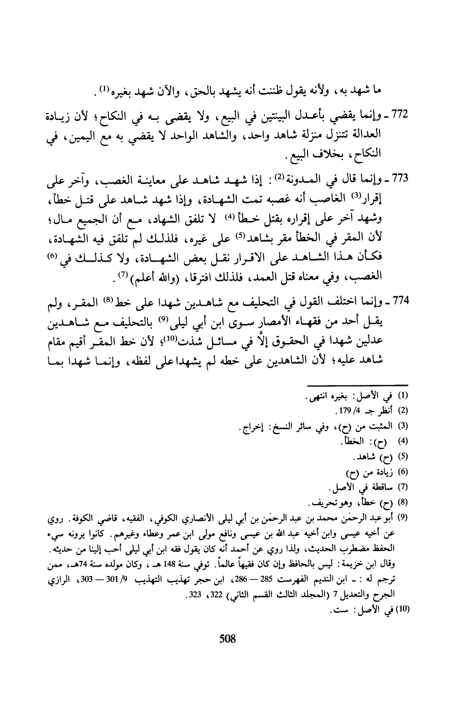 (¬9) أبو عبد الرحمن محمد بن عبد الرحمن بن أبي ليلى الأنصاري الكوفي، الفقيه، قاضي الكوفة. روي عن أخيه عيسى وابن أخيه عبد الله بن عيسى ونافع مولى ابن عمر وعطاء وغيرهم. كانوا يرونه سيء الحفظ مضطرب الحديث، ولذا روي عن أحمد أنه كان يقول فقه ابن أبي ليلى أحب إلينا من حديثه. وقال ابن خزيمة: ليس بالحافظ وإن كان فقيهًا عالمًا. توفي سنة 148 هـ، وكان مولده سنة 74 هـ، ممن ترجم له: - ابن النديم الفهرست 285 - 286، ابن حجر تهذيب التهذيب 9/ 301 - 303، الرازي الجرح والتعديل 7 (المجلد الثالث القسم الثاني) 322، 323.