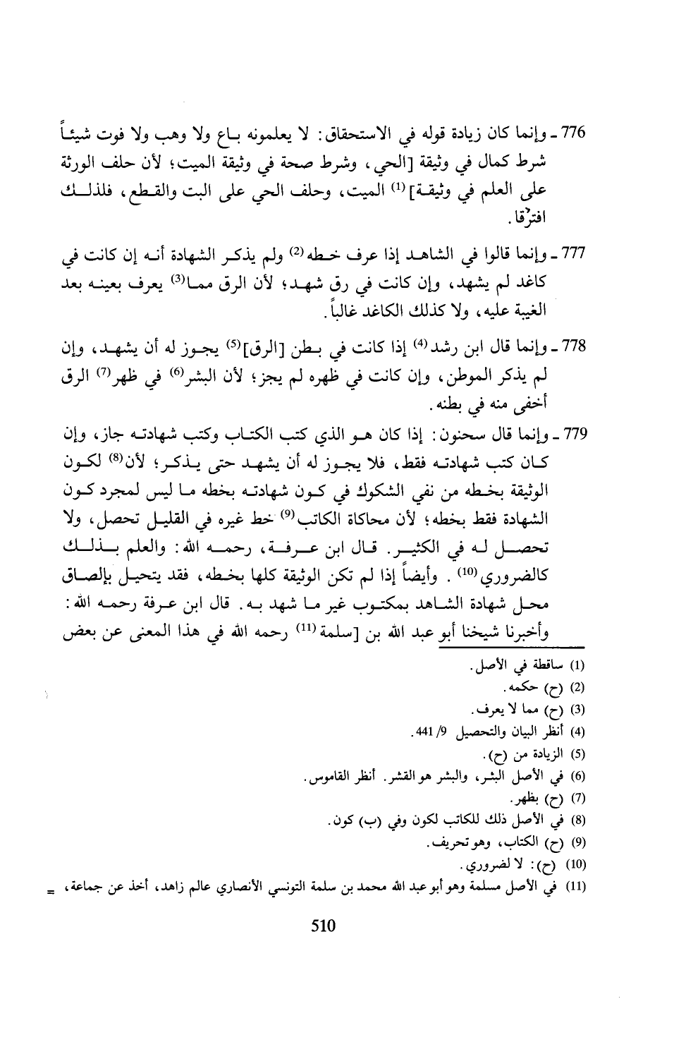 778 - وإنما قال ابن رشد (¬4) إذا كانت في بطن [الرق] (¬5) يجوز له أن يشهد، وإن لم يذكر الموطن، وإن كانت في ظهره لم يجز؛ لأن البشر (¬6) في ظهر (¬7) الرق أخفى منه في بطنه.