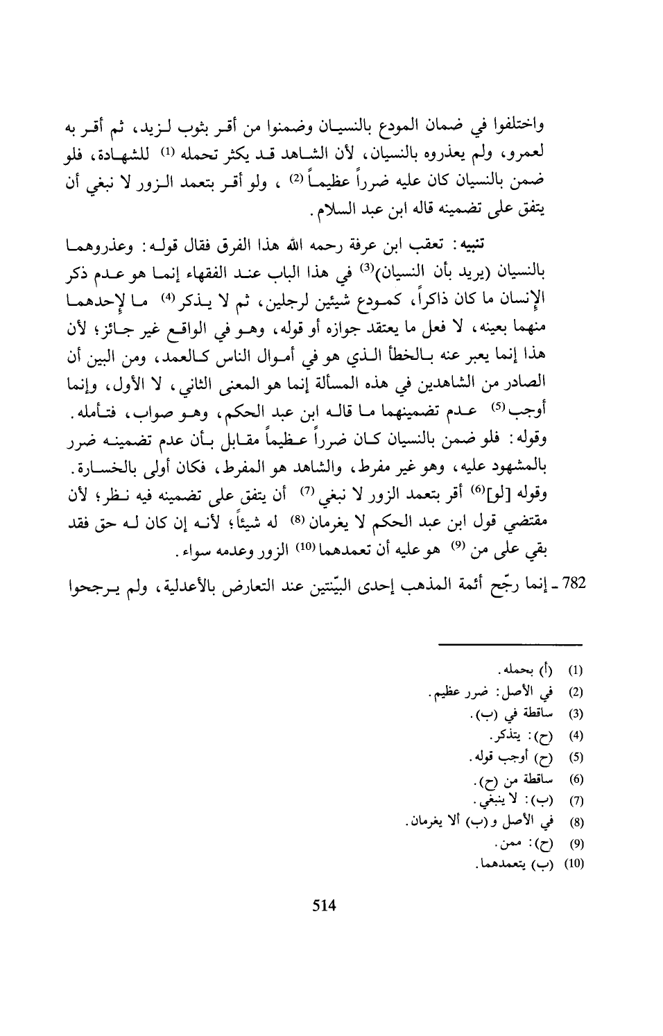 تنبيه: تعقب ابن عرفة رحمه الله هذا الفرق فقال قوله: وعذروهما بالنسيان (يريد بأن النسيان) (¬3) في هذا الباب عند الفقهاء إنما هو عدم ذكر الإِنسان ما كان ذاكرًا، كمودع شيئين لرجلين، ثم لا يذكر (¬4) ما لإِحدهما منهما بعينه، لا فعل ما يعتقد جوازه أو قوله، وهو في الواقع غير جائز؛ لأن هذا إنما يعبر عنه بالخطأ الذي هو في أموال الناس كالعمد، ومن البين أن الصادر من الشاهدين في هذه المسألة إنما هو المعنى الثاني، لا الأول، وإنما أوجب (¬5) عدم تضمينهما ما قاله ابن عبد الحكم، وهو صواب، فتأمله. وقوله: فلو ضمن بالنسيان كان ضررًا عظيمًا مقابل بأن عدم تضمينه ضرر بالمشهود عليه، وهو غير مفرط، والشاهد هو المفرط، فكان أولى بالخسارة. وقوله [لو] (¬6) أقر بتعمد الزور لا نبغي (¬7) أن يتفق على تضمينه فيه نظر؛ لأن مقتضي قول ابن عبد الحكم لا يغرمان (¬8) له شيئًا؛ لأنه إن كان له حق فقد بقي على من (¬9) هو عليه أن تعمدهما (¬10) الزور وعدمه سواء.