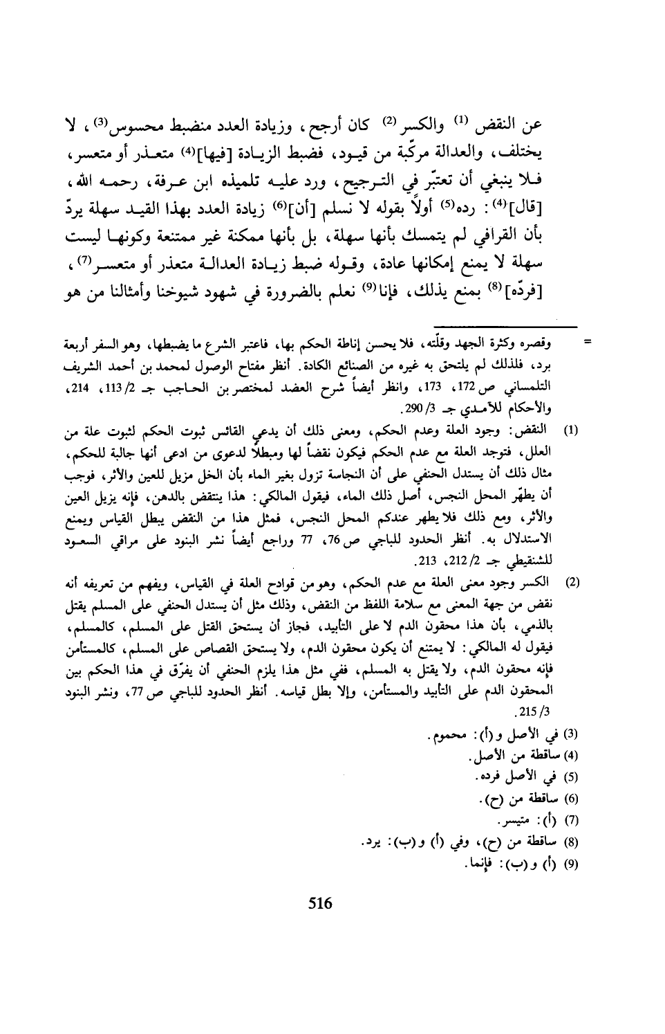 عن النقض (¬1) والكسر (¬2) كان أرجح، وزيادة العدد منضبط محسوس (¬3)، لا يختلف، والعدالة مركّبة من قيود، فضبط الزيادة [فيها] (4) متعذر أو متعسر، فلا ينبغي أن تعتبر في الترجيح، ورد عليه تلميذه ابن عرفة، رحمه الله، [قال] (¬4): رده (¬5) أولًا بقوله لا نسلم [أن] (¬6) زيادة العدد بهذا القيد سهلة يردّ بأن القرافي لم يتمسك بأنها سهلة، بل بأنها ممكنة غير ممتنعة وكونها ليست سهلة لا يمنع إمكانها عادة، وقوله ضبط زيادة العدالة متعذر أو متعسر (¬7)، [فردّه] (¬8) بمنع يذلك، فإنا (¬9) نعلم بالضرورة في شهود شيوخنا وأمثالنا من هو
