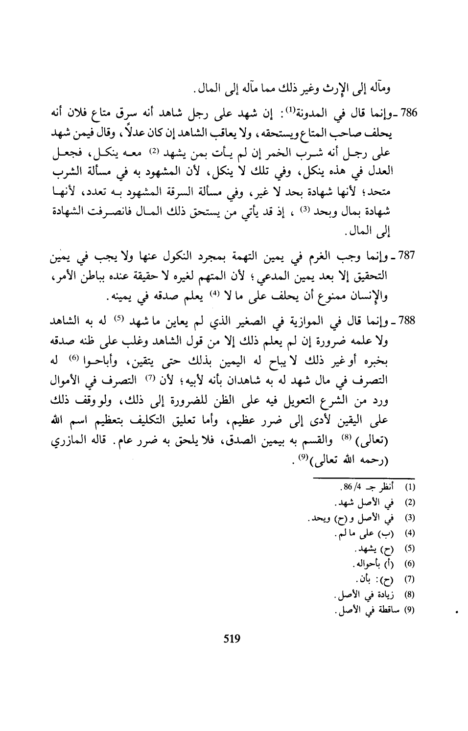 787 - وإنما وجب الغرم في يمين التهمة بمجرد النكول عنها ولا يجب في يمين التحقيق إلا بعد يمين المدعي؛ لأن المتهم لغيره لا حقيقة عنده بباطن الأمر، والإِنسان ممنوع أن يحلف على ما لا (¬4) يعلم صدقه في يمينه.