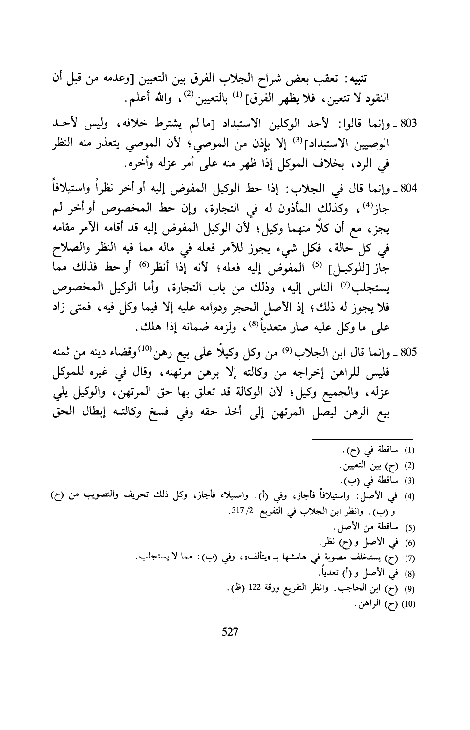 805 - وإنما قال ابن الجلاب (¬9) من وكل وكيلًا على بيع رهن (¬10) وقضاء دينه من ثمنه فليس للراهن إخراجه من وكالته إلا برهن مرتهنه، وقال في غيره للموكل عزله، والجميع وكيل؛ لأن الوكالة قد تعلق بها حق المرتهن، والوكيل يلي بيع الرهن ليصل المرتهن إلى أخذ حقه وفي فسخ وكالته إبطال الحق