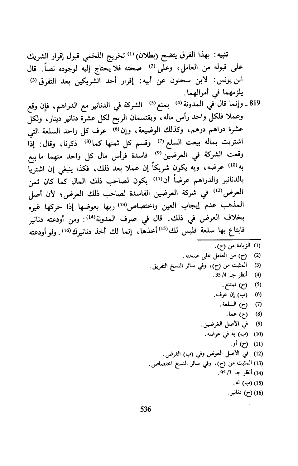 819 - وإنما قال في المدونة (¬4) بمنع (¬5) الشركة في الدنانير مع الدراهم، فإِن وقع وعملا فلكل واحد رأس ماله، ويقتسمان الربح لكل عشرة دنانير دينار، ولكل عشرة دراهم درهم، وكذلك الوضيعة، وإن (¬6) عرف كل واحد السلعة التي اشتريت بماله بيعت السلع (¬7) وقسم كل ثمنها كما (¬8) ذكرنا، وقال: إذا وقعت الشركة في العرضين (¬9) فاسدة فرأس مال كل واحد منهما ما بيع به (¬10) عرضه، وبه يكون شريكًا إن عملا بعد ذلك، فكذا ينبغي إن اشتريا بالدنانير والدراهم عرضًا أن (¬11) يكون لصاحب ذلك المال كما كان ثمن العرض (¬12) في شركة العرضين الفاسدة لصاحب ذلك العرض؛ لأن أصل المذهب عدم إيجاب العين واختصاص (¬13) ربها بعوضها إذا حركها غيره بخلاف العرض في ذلك. قال في صرف المدونة (¬14): ومن أودعته دنانير فابتاع بها سلعة فليس لك (¬15) أخذها، إنما لك أخذ دنانيرك (¬16). ولو أودعته