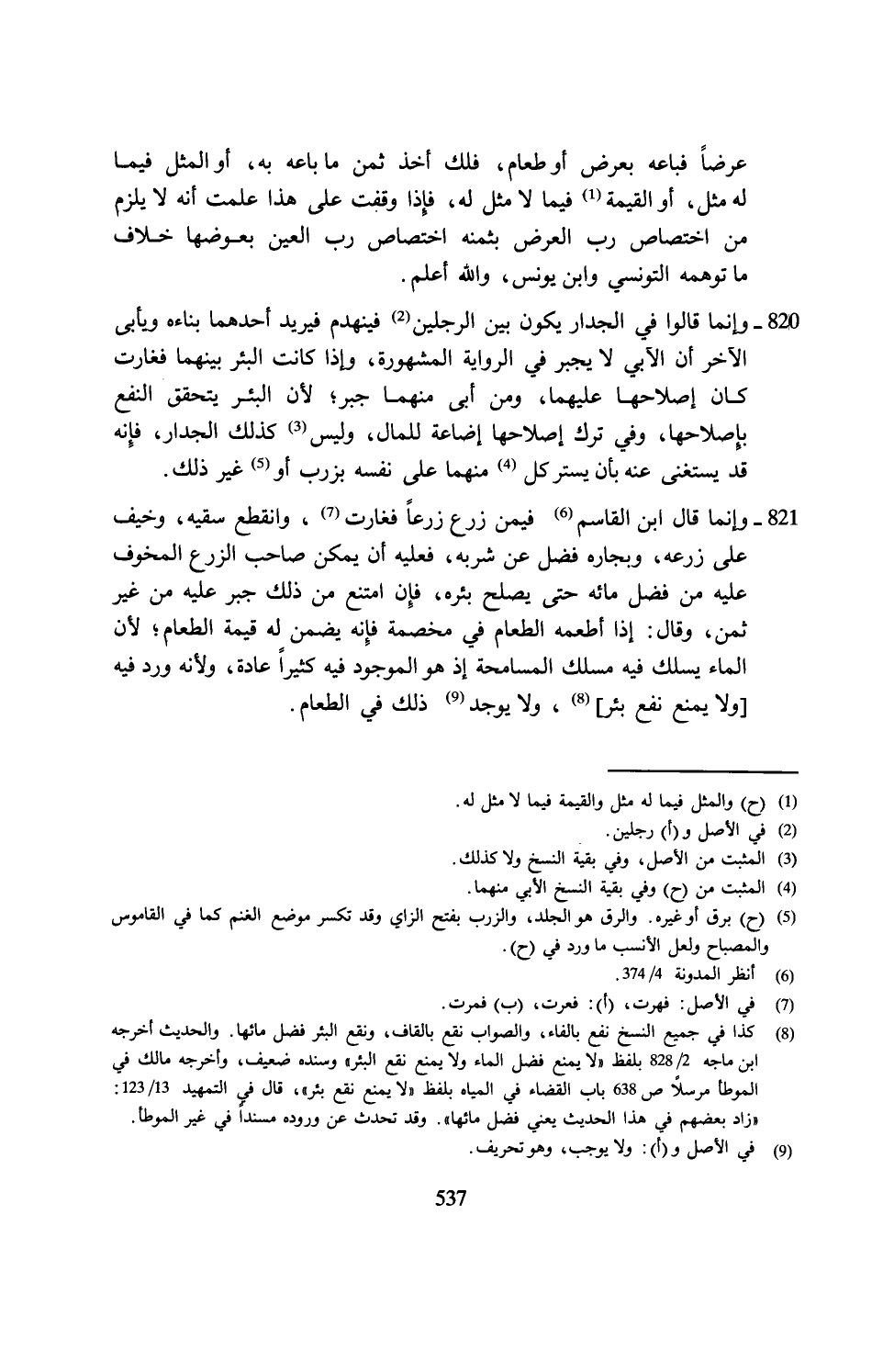(¬8) كذا في جميع النسخ نفع بالفاء، والصواب نقع بالقاف، ونقع البئر فضل مائها. والحديث أخرجه ابن ماجه 2/ 828 بلفظ "لا يمنع فضل الماء ولا يمنع نقع البئر" وسنده ضعيف، وأخرجه مالك في الموطأ مرسلًا ص 638 باب القضاء في المياه بلفظ "لا يمنع نقع بئر"، قال في التمهيد 13/ 123: "زاد بعضهم في هذا الحديث يعني فضل مائها". وقد تحدث عن وروده مسندًا في غير الموطأ.