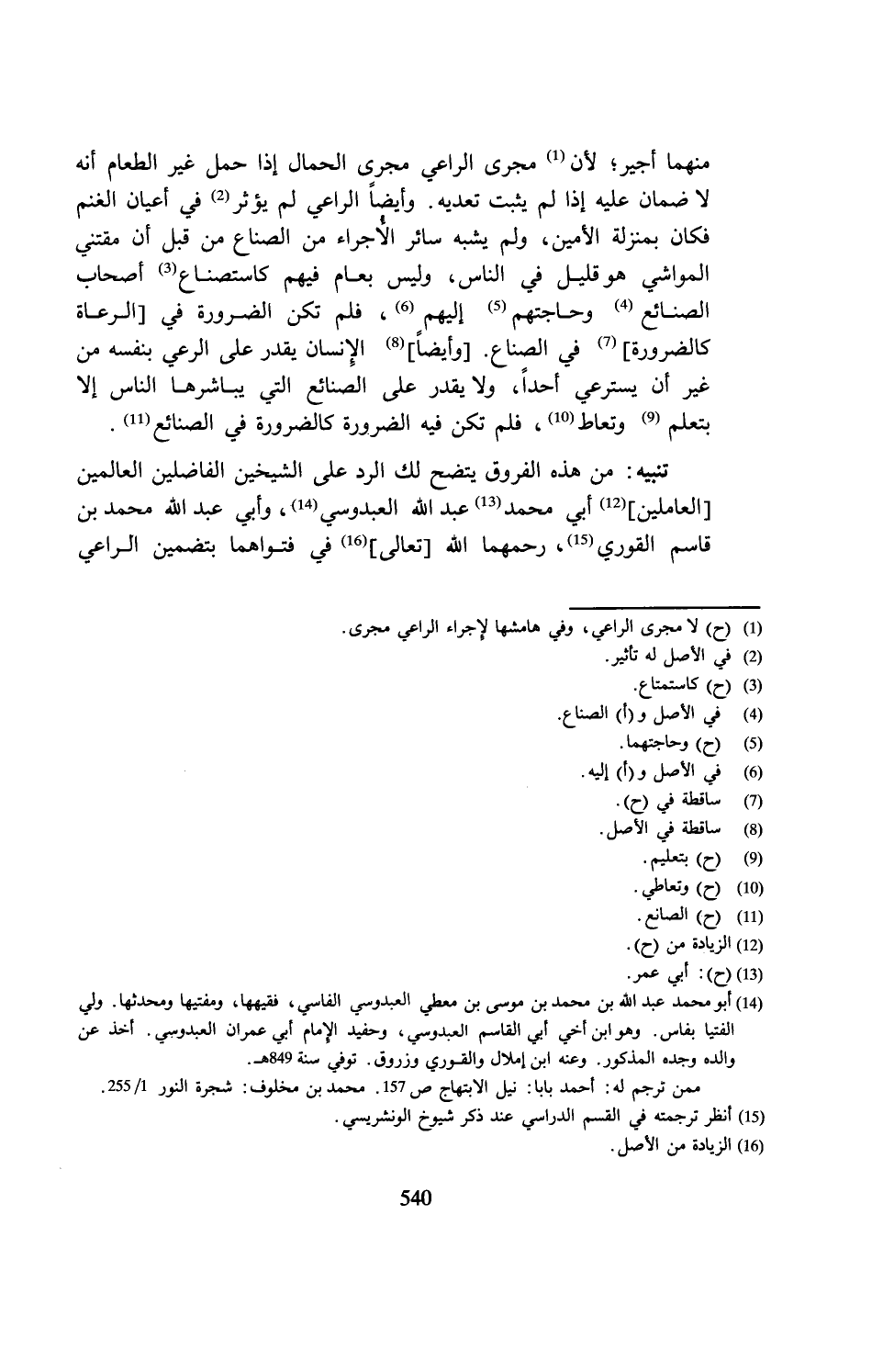 تنبيه: من هذه الفروق يتضح لك الرد على الشيخين الفاضلين العالمين [العاملين] (¬12) أبي محمد (¬13) عبد الله العبدوسي (¬14)، وأبي عبد الله محمد بن قاسم القوري (¬15)، رحمهما الله [تعالى] (¬16) في فتواهما بتضمين الراعي