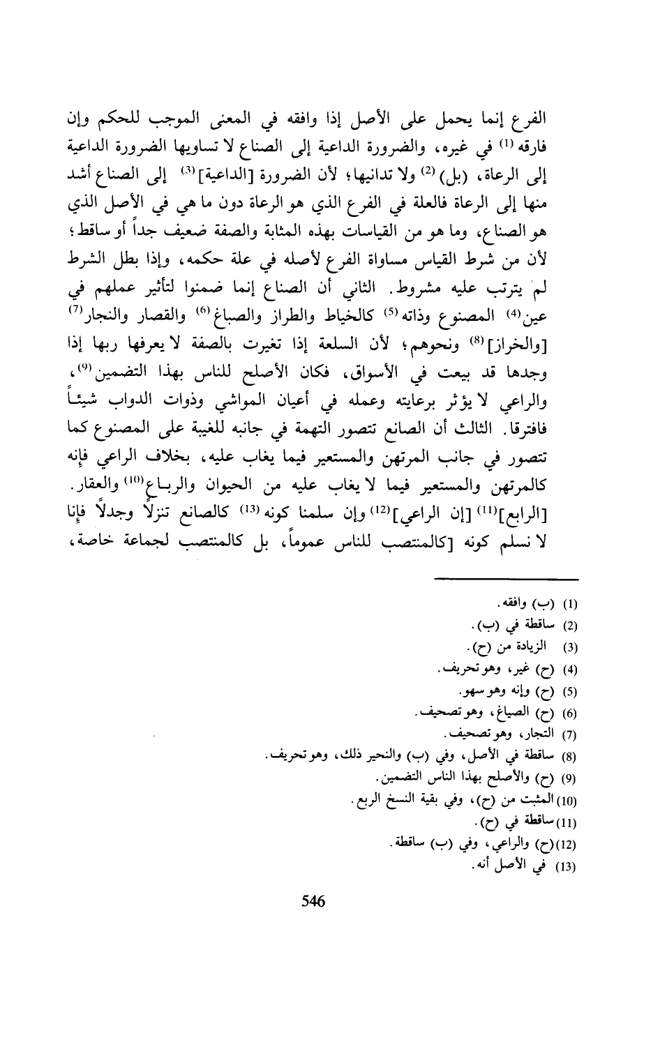 الفرع إنما يحمل على الأصل إذا وافقه في المعنى الموجب للحكم وإن فارقه (¬1) في غيره، والضرورة الداعية إلى الصناع لا تساويها الضرورة الداعية إلى الرعاة، (بل) (¬2) ولا تدانيها؛ لأن الضرورة [الداعية] (¬3) إلى الصناع أشد منها إلى الرعاة فالعلة في الفرع الذي هو الرعاة دون ما هي في الأصل الذي هو الصناع، وما هو من القياسات بهذه المثابة والصفة ضعيف جدًّا أو ساقط؛ لأن من شرط القياس مساواة الفرع لأصله في علة حكمه، وإذا بطل الشرط لم يترتب عليه مشروط. الثاني أن الصناع إنما ضمنوا لتأثير عملهم في عين (¬4) المصنوع وذاته (¬5) كالخياط والطراز والصباغ (¬6) والقصار والنجار (¬7) [والخراز] (¬8) ونحوهم؛ لأن السلعة إذا تغيرت بالصفة لا يعرفها ربها إذا وجدها قد بيعت في الأسواق، فكان الأصلح للناس بهذا التضمين (¬9)، والراعي لا يؤثر برعايته وعمله في أعيان المواشي وذوات الدواب شيئًا فافترقا. الثالث أن الصانع تتصور التهمة في جانبه للغيبة على المصنوع كما تتصور في جانب المرتهن والمستعير فيما يغاب عليه، بخلاف الراعي فإِنه كالمرتهن والمستعير فيما لا يغاب عليه من الحيوان والرباع (¬10)، والعقار. [الرابع] (¬11) [إن الراعي] (¬12) وإن سلمنا كونه (¬13) كالصانع تنزلًا وجدلًا فإِنا لا نسلم كونه [كالمنتصب للناس عمومًا، بل كالمنتصب لجماعة خاصة،