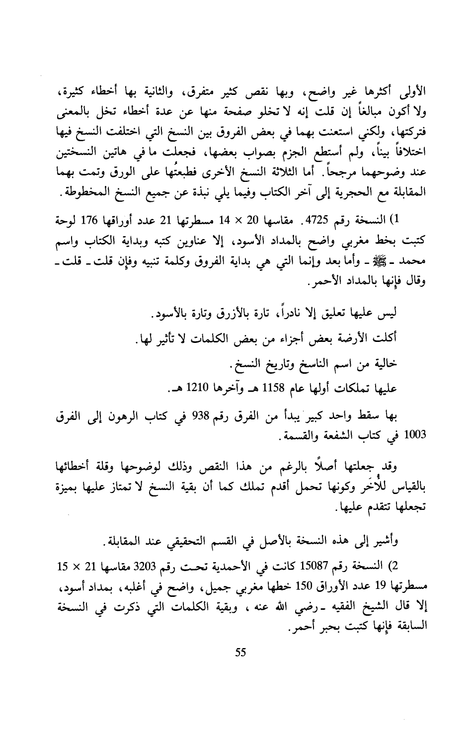 2) النسخة رقم 15087 كانت في الأحمدية تحت رقم 3203 مقاسها 21 × 15 مسطرتها 19 عدد الأوراق 150 خطها مغربي جميل، واضح في أغلبه، بمداد أسود، إلا قال الشيخ الفقيه - رضي الله عنه، وبقية الكلمات التي ذكرت في النسخة السابقة فإِنها كتبت بحبر أحمر.