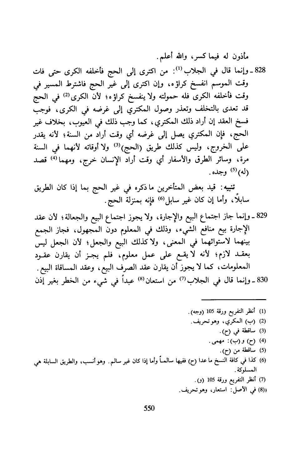 828 - وإنما قال في الجلاب (¬1): من اكترى إلى الحج فأخلفه الكرى حتى فات وقت الموسم انفسخ كراؤه، وإن اكترى إلى غير الحج فاشترط المسير في وقت فأخلفه الكرى فله حمولته ولا ينفسخ كراؤه؛ لأن الكرى (¬2) في الحج قد تعدى بالتخلف وتعذر وصول المكتري إلى غرضه في الكرى، فوجب فسخ العقد إن أراد ذلك المكتري، كما وجب ذلك في العيوب، بخلاف غير الحج، فإِن المكتري يصل إلى غرضه أي وقت أراد من السنة؛ لأنه يقدر على الخروج، وليس كذلك طريق (الحج) (¬3) ولا أوقاته لأنهما في السنة مرة، وسائر الطرق والأسفار أي وقت أراد الإِنسان خرج، ومهما (¬4) قصد (له) (¬5) وجده.