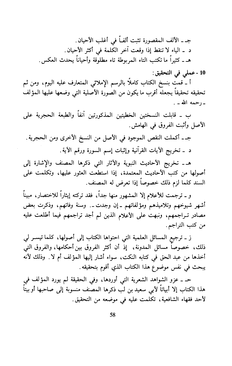 حـ- عزو الشواهد الشعرية التي أوردها، وفي الحقيقة لم يورد المؤلف في هذا الكتاب إلا أبياتًا لأبي سعيد بن لب ذكرها المصنف منسوبة إلى صاحبها أو بيتًا لأحد فقهاء الشافعية، تكلمت عليه في موضعه من التحقيق.