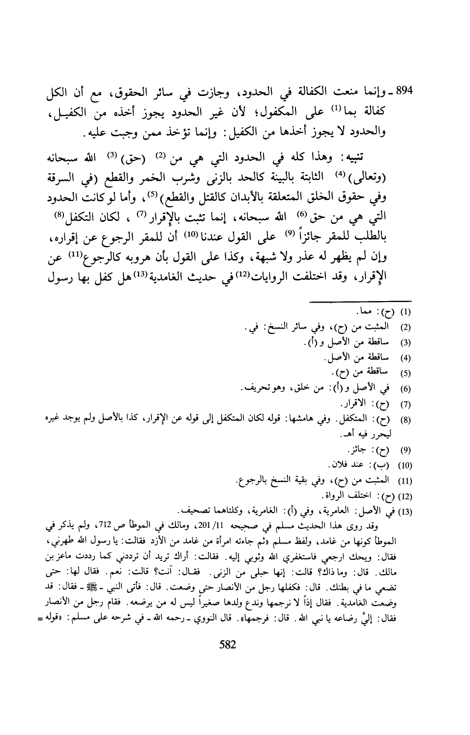 تنبيه: وهذا كله في الحدود التي هي من (¬2) (حق) (¬3) الله سبحانه (وتعالى) (¬4) الثابتة بالبينة كالحد بالزنى وشرب الخمر والقطع (في السرقة وفي حقوق الخلق المتعلقة بالأبدان كالقتل والقطع) (¬5)، وأما لو كانت الحدود التي هي من حق (¬6) الله سبحانه، إنما تثبت بالإِقرار (¬7)، لكان التكفل (¬8) بالطلب للمقر جائزًا (¬9) على القول عندنا (¬10) أنَّ للمقر الرجوع عن إقراره، وإن لم يظهر له عذر ولا شبهة، وكذا على القول بأن هروبه كالرجوع (¬11) عن الإِقرار، وقد اختلفت الروايات (¬12) في حديث الغامدية (¬13) هل كفل بها رسول