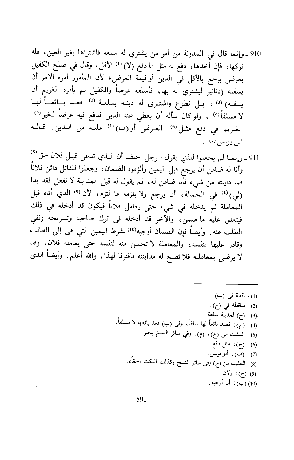 911 - وإنما لم يجعلوا للذي يقول لرجل احلف أن الذي تدعى قبل فلان حق (¬8) وأنا له ضامن أن يرجع قبل اليمين وألزموه الضمان، وجعلوا للقائل دائن فلانًا فما داينته من شيء فأنا ضامن له، ثمَّ يقول له قبل المداينة لا تفعل فقد بدا (لي) (1) في الحمالة، أن يرجع ولا يلزمه ما التزم؛ لأنَّ (¬9) الذي أتاه قبل المعاملة لم يدخله في شيء حتى يعامل فلانًا فيكون قد أدخله في ذلك فيتعلق عليه ما ضمن، والآخر قد أدخله في ترك صاحبه وتسريحه ونفي الطلب عنه. وأيضًا فإِن الضمان أوجبه (¬10) بشرط اليمين التي هي إلى الطالب وقادر عليها بنفسه، والمعاملة لا تحسن منه لنفسه حتى يعامله فلان، وقد لا يرضى بمعاملته فلا تصح له مداينته فافترقا لهذا، والله أعلم. وأيضًا الذي