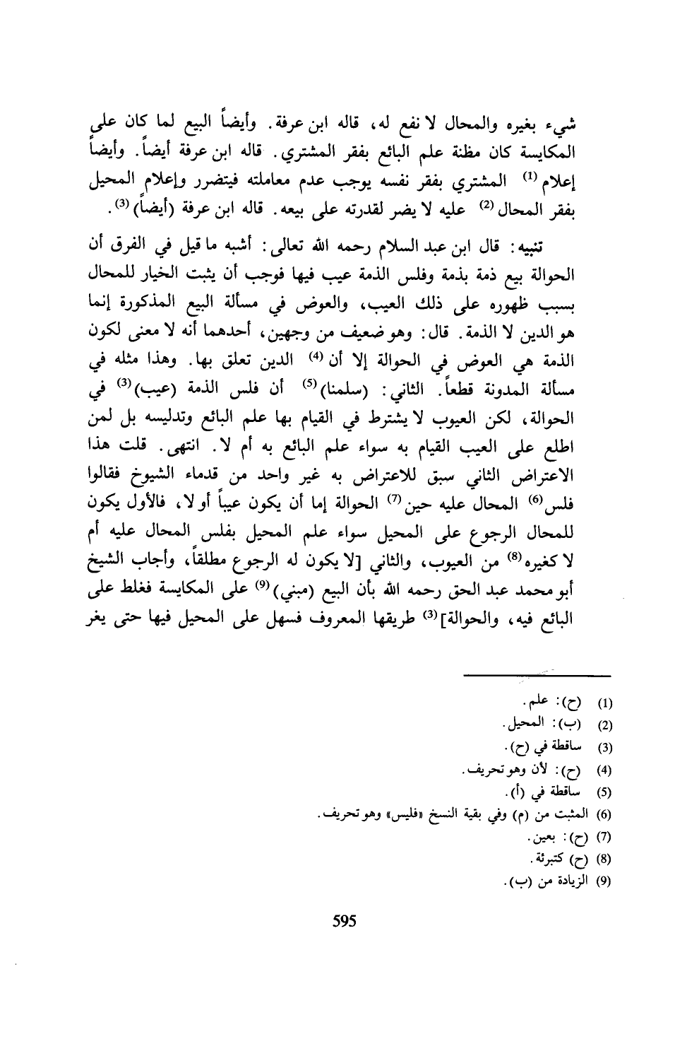 تنبيه: قال ابن عبد السلام رحمه الله تعالى: أشبه ما قيل في الفرق أن الحوالة بيع ذمة بذمة وفلس الذمة عيب فيها فوجب أن يثبت الخيار للمحال بسبب ظهوره على ذلك العيب، والعوض في مسألة البيع المذكورة إنما هو الدين لا الذمة. قال: وهو ضعيف من وجهين، أحدهما أنَّه لا معنى لكون الذمة هي العوض في الحوالة إلا أن (¬4) الدين تعلق بها. وهذا مثله في مسألة المدونة قطعًا. الثاني: (سلمنا) (¬5) أن فلس الذمة (عيب) (3) في الحوالة، لكن العيوب لا يشترط في القيام بها علم البائع وتدليسه بل لمن اطلع على العيب القيام به سواء علم البائع به أم لا. انتهى. قلت هذا الاعتراض الثاني سبق للاعتراض به غير واحد من قدماء الشيوخ فقالوا فلس (¬6) المحال عليه حين (¬7) الحوالة إما أن يكون عيبًا أو لا، فالأول يكون للمحال الرجوع على المحيل سواء علم المحيل بفلس المحال عليه أم لا كغيره (¬8) من العيوب، والثاني [لا يكون له الرجوع مطلقًا، وأجاب الشيخ أبو محمد عبد الحق رحمه الله بأن البيع (مبني) (¬9) على المكايسة فغلط على البائع فيه، والحوالة] (3) طريقها المعروف فسهل على المحيل فيها حتى يغر