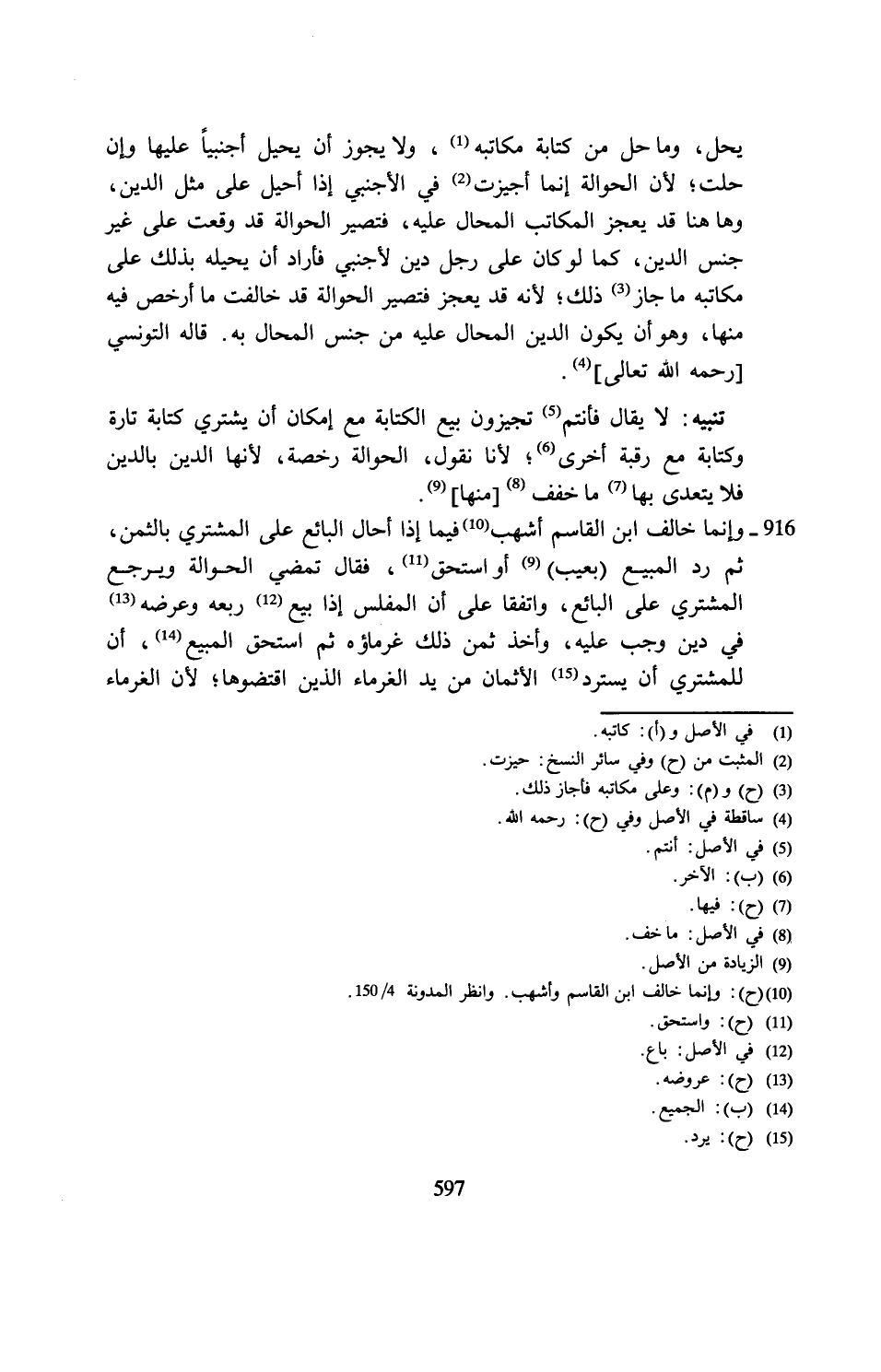تنبيه: لا يقال فأنتم (¬5) تجيزون بيع الكتابة مع إمكان أن يشتري كتابة تارة وكتابة مع رقبة أخرى (¬6)؛ لأنا نقول، الحوالة رخصة، لأنها الدين بالدين فلا يتعدى بها (¬7) ما خفف (¬8) [منها] (¬9).