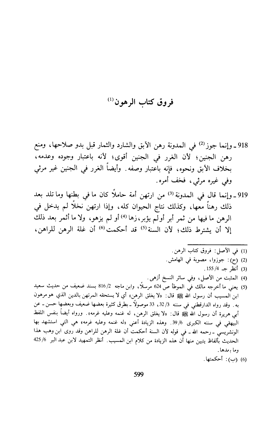 (¬5) يعني ما أخرجه مالك في الموطأ ص 624 مرسلًا، وابن ماجه 2/ 816 بسند ضعيف من حديث سعيد بن المسيب أن رسول الله - صلى الله عليه وسلم - قال: "لا يغلق الرهن" أي لا يستحقه المرتهن بالدين الذي هو مرهون به. وقد رواه الدارقطني في سننه 3/ 32، 33 موصولًا -بطرق كثيرة بعضها ضعيف وبعضها حسن- عن أبي هريرة أن رسول الله - صلى الله عليه وسلم - قال: "لا يغلق الرهن، له غنمه وعليه غرمه". ورواه أيضًا بنفس اللفظ البيهقي في سننه الكبرى 6/ 39. وهذه الزيادة أعني "له غنمه وعليه غرمه" هي التي استشهد بها الونشريسي -رحمه الله- في قوله لأنَّ السنة أحكمت أن غلة الرهن للراهن وقد روى ابن وهب هذا الحديث بألفاظ يتبين منها أن هذه الزيادة من كلام ابن المسيب. انظر التمهيد لابن عبد البر 6/ 425 وما بعدها.