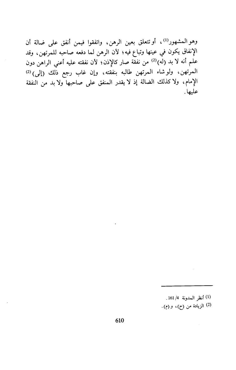 وهو المشهور (¬1)، أو تتعلق بعين الرهن، واتفقوا فيمن أنفق على ضالة أن الإِنفاق يكون في عينها وتباع فيه؛ لأنَّ الرهن لما دفعه صاحبه للمرتهن، وقد علم أنَّه لا بد (له) (2) من نفقة صار كالإِذن؛ لأنَّ نفقته عليه أعني الراهن دون المرتهن، ولو شاء المرتهن طالبه بنفقته، وإن غاب رجع ذلك (إلى) (¬2) الإِمام، ولا كذلك الضَّالة إذ لا يقدر المنفق على صاحبها ولا بد من النفقة عليها.