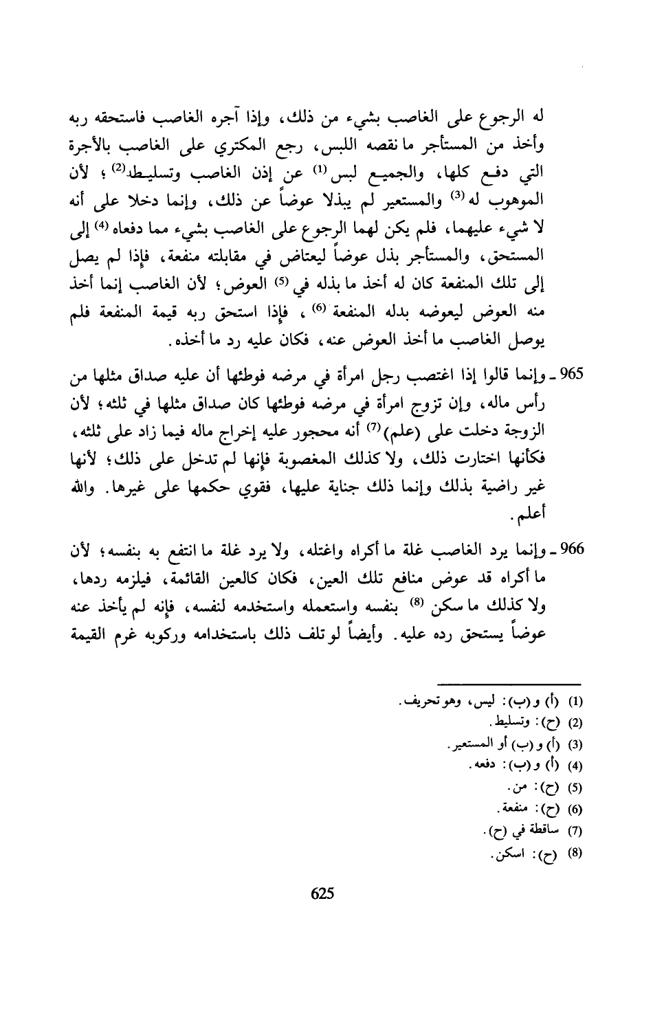 965 - وإنَّما قالوا إذا اغتصب رجل امرأة في مرضه فوطئها أن عليه صداق مثلها من رأس ماله، وإن تزوج امرأة في مرضه فوطئها كان صداق مثلها في ثلثه؛ لأنَّ الزوجة دخلت على (علم) (¬7) أنَّه محجور عليه إخراج ماله فيما زاد على ثلثه، فكأنها اختارت ذلك، ولا كذلك المغصوبة فإِنها لم تدخل على ذلك؛ لأنها غير راضية بذلك وإنَّما ذلك جناية عليها، فقوي حكمها على غيرها. والله أعلم.