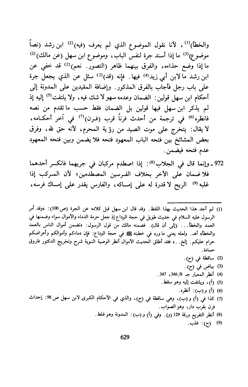 (¬1) لم أجد هذا الحديث بهذا اللفظ. وقد قال ابن سهل قبل كلامه عن الجرة (ص 100): "وقد أمر الرسول عليه السَّلام في حديث طويل في حجة الوداع إذ جعل حرمة الدماء والأموال سواء وضمنها في العمد والخطأ ... (إلى أن قال). فضمنه مالك من قول الرسول: "تضمن أموال النَّاس بالعمد والخطأ" أهـ. ولعلّه يعني ما ورد في خطبته - صلى الله عليه وسلم - في حجة الوداع: فإن دماءكم وأموالكم وأعراضكم حرام عليكم. إلخ .. " فقد أطلق الحديث الأموال انظر الوصيَّة النبوية شرح وتخريج الدكتور فاروق حمادة.