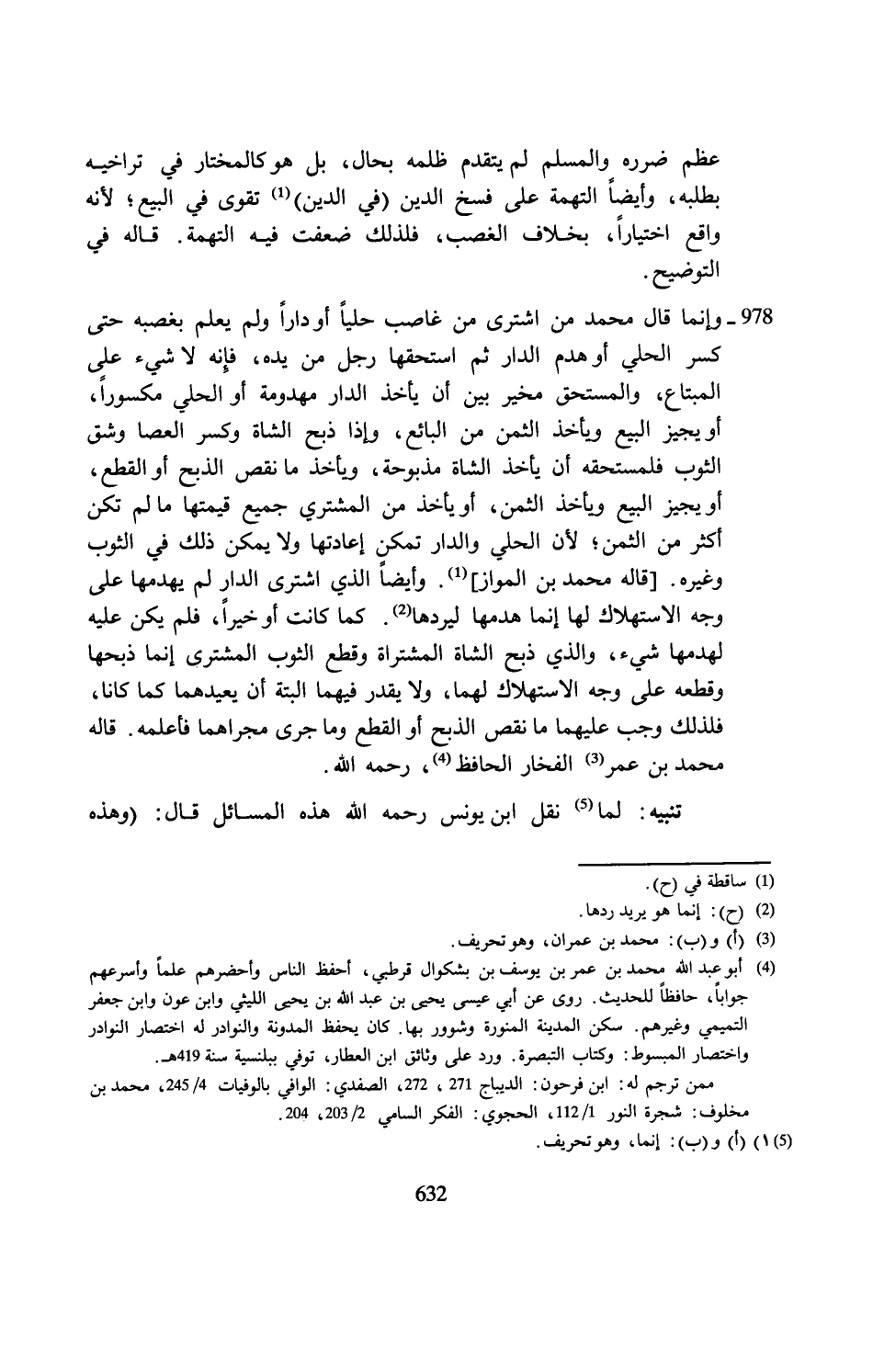 978 - وإنَّما قال محمَّد من اشترى من غاصب حليًّا أو دارًا ولم يعلم بغصبه حتَّى كسر الحلي أو هدم الدار ثم استحقها رجل من يده، فإنَّه لا شيء على المبتاع، والمستحق مخير بين أن يأخذ الدار مهدومة أو الحلي مكسورًا، أو يجيز البيع ويأخذ الثمن من البائع، وإذا ذبح الشَّاة وكسر العصا وشق الثوب فلمستحقه أن يأخذ الشَّاة مذبوحة، ويأخذ ما نقص الذبح أو القطع، أو يجيز البيع ويأخذ الثمن، أو يأخذ من المشتري جميع قيمتها ما لم تكن أكثر من الثمن؛ لأنَّ العلي والدار تمكن إعادتها ولا يمكن ذلك في الثوب وغيره. [قاله محمَّد بن المواز] (1). وأيضًا الذي اشترى الدار لم يهدمها على وجه الاستهلاك لها إنَّما هدمها ليردها (¬2). كما كانت أو خيرًا، فلم يكن عليه لهدمها شيء، والذي ذبح الشَّاةِ المشتراة وقطع الثوب المشتري إنَّما ذبحها وقطعه على وجه الاستهلاك لهما، ولا يقدر فيهما البتة أن يعيدهما كما كانا، فلذلك وجب عليهما ما نقص الذبح أو القطع وما جرى مجراهما فأعلمه. قاله محمَّد بن عمر (¬3) الفخار الحافظ (¬4)، رحمه الله.
