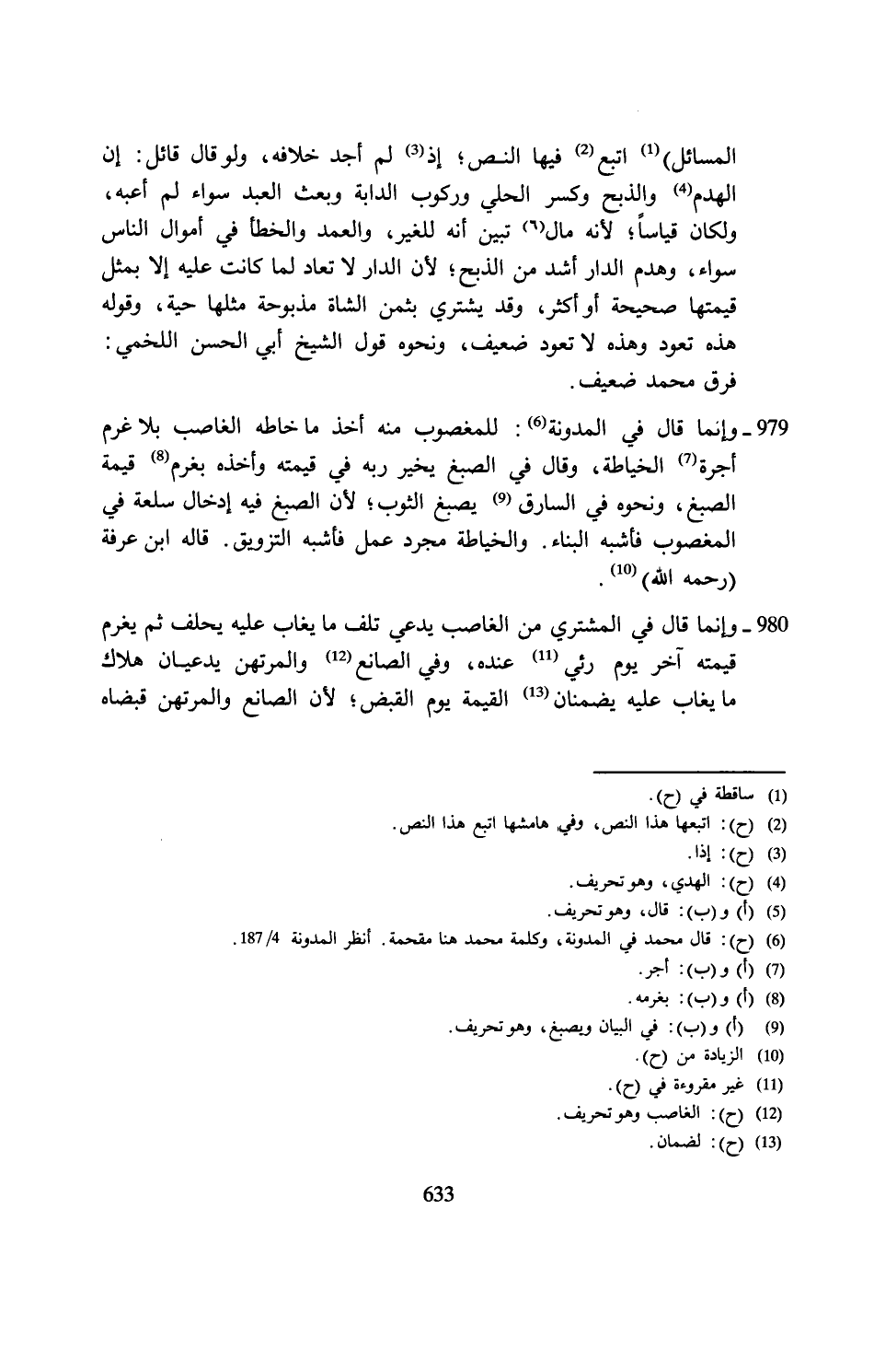المسائل) (¬1) اتبع (¬2) فيها النص؛ إذ (¬3) لم أجد خلافه، ولو قال قائل: إن الهدم (¬4) والذبح وكسر الحلي وركوب الدابة وبعث العبد سواء لم أعبه، ولكان قياسًا؛ لأنَّه مال (¬5) تبيّن أنَّه للغير، والعمد والخطأ في أموال النَّاس سواء، وهدم الدار أشد من الذبح؛ لأنَّ الدار لا تعاد لما كانت عليه إلَّا بمثل قيمتها صحيحة أو أكثر، وقد يشتري بثمن الشَّاةِ مذبوحة مثلها حية، وقوله هذه تعود وهذه لا تعود ضعيف، ونحوه قول الشَّيخ أبي الحسن اللخمي: فرق محمَّد ضعيف.