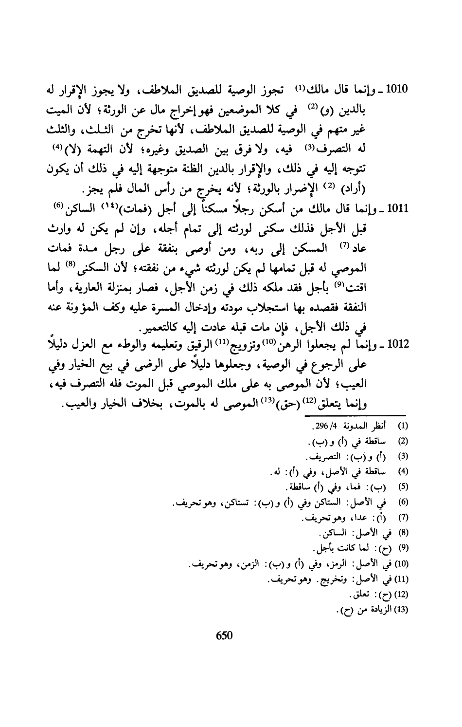 1010 - وإنَّما قال مالك (¬1) تجوز الوصيَّة للصديق الملاطف، ولا يجوز الإقرار له بالدين (و) (¬2) في كلا الموضعين فهو إخراج مال عن الورثة؛ لأنَّ الميت غير متهم في الوصيَّة للصديق الملاطف، لأنها تخرج من الثُّلث، والثلث له التصرف (¬3) فيه، ولا فرق بين الصديق وغيره؛ لأنَّ التهمة (لا) (¬4) تتوجه إليه في ذلك، والإقرار بالدين الظنة متوجهة إليه في ذلك أن يكون (أراد) (2) الإضرار بالورثة؛ لأنَّه يخرج من رأس المال فلم يجز.