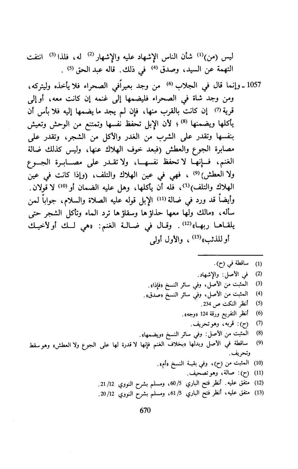 1057 - وإنما قال في الجلاب (¬6) من وجد بعيرًا في الصحراء فلا يأخذه وليتركه، ومن وجد شاة في الصحراء فليضمها إلى غنمه إن كانت معه، أو إلى قرية (¬7) إن كانت بالقرب منها، فإن لم يجد ما يضمها إليه فلا بأس أن يأكلها ويضمنها (¬8)؛ لأن الإِبل تحفظ نفسها وتمتنع من الوحش وتعيش بنفسها وتقدر على الشرب من الغدر والأكل من الشجر، وتقدر على مصابرة الجوع والعطش (فبعد خوف الهلاك عنها، وليس كذلك ضالة الغنم، فإِنها لا تحفظ نفسها، ولا تقدر على مصابرة الجوع ولا العطش) (¬9)، فهي في عين الهلاك والتلف، (وإذا كانت في عين الهلاك والتلف) (1)، فله أن يأكلها، وهل عليه الضمان أو (¬10) لا قولان. وأيضًا قد ورد في ضالة (¬11) الإبل قوله عليه الصلاة والسلام، جوابًا لمن سأله، "مالك ولها معها حذاؤها وسقاؤها ترد الماء وتأكل الشجر حتى يلقاها ربها" (¬12). وقال في ضالة الغنم: "هي لك أو لأخيك أو للذئب" (¬13)، والأول أولى