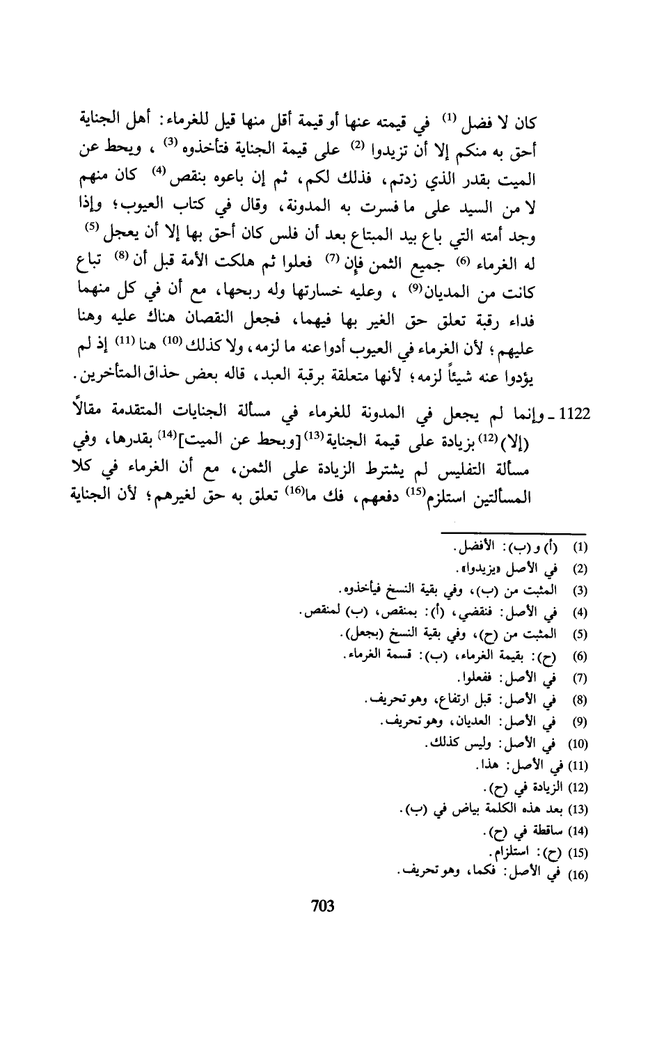 1122 - وإنما لم يجعل في المدونة للغرماء في مسألة الجنايات المتقدمة مقالًا (إلَّا) (¬12) بزيادة على قيمة الجناية (¬13) [وبحط عن الميت] (¬14) بقدرها، وفي مسألة التفليس لم يشترط الزيادة على الثمن، مع أن الغرماء في كلا المسألتين استلزم (¬15) دفعهم، فك ما (¬16) تعلق به حق لغيرهم؛ لأن الجناية