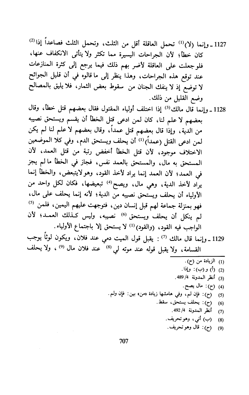 1129 - وإنما قال مالك (¬7): يقبل قول الميت دمي عند فلان، ويكون لوثًا يوجب القسامة، ولا يقبل قوله عند موته لي (¬8) عند فلان مال (¬9)، ولا يحلف