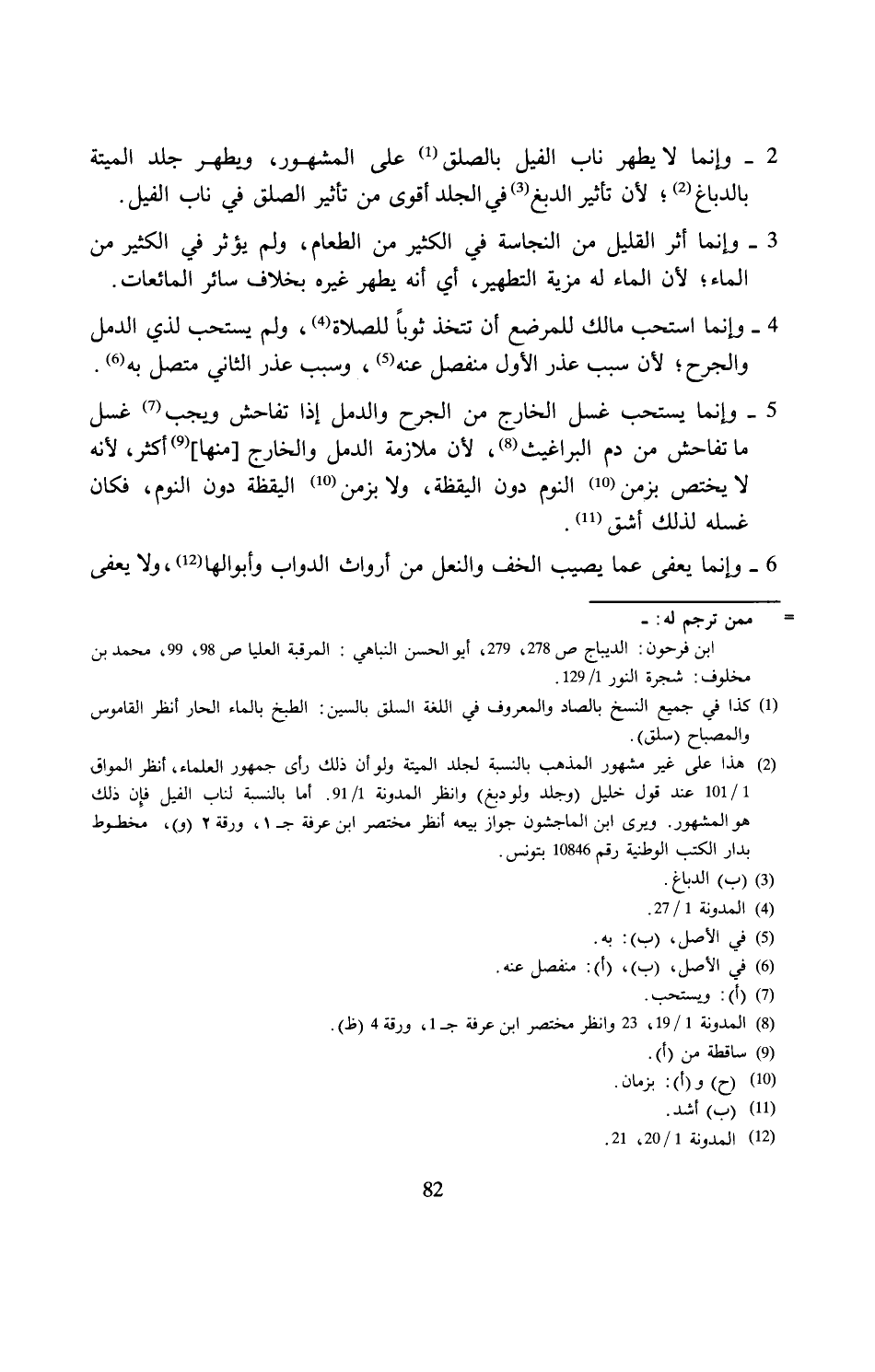 (¬2) هذا على غير مشهور المذهب بالنسبة لجلد الميتة ولو أن ذلك رأى جمهور العلماء، انظر المواق 1/ 101 عند قول خليل (وجلد ولو دبغ) وانظر المدونة 1/ 91. أما بالنسبة لناب الفيل فإِن ذلك هو المشهور. ويرى ابن الماجشون جواز بيعه انظر مختصر ابن عرفة جـ 1، ورقة 2 (و)، مخطوط بدار الكتب الوطنية رقم 10846 بتونس.
