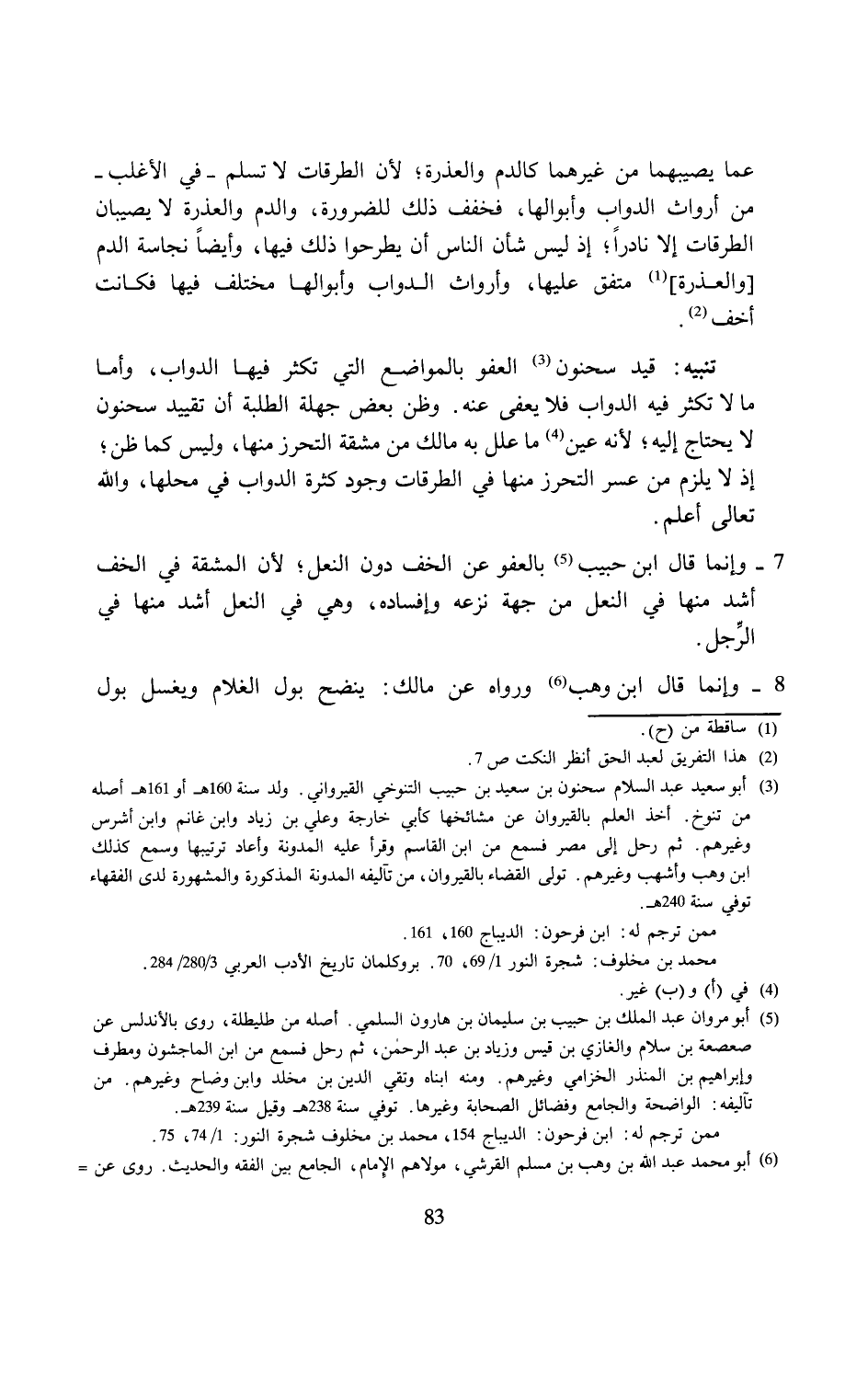 (¬3) أبو سعيد عبد السلام سحنون بن سعيد بن حبيب التنوخي القيرواني. ولد سنة 160 هـ أو 161 هـ أصله من تنوخ. أخذ العلم بالقيروان عن مشائخها كأبي خارجة وعلي بن زياد وابن غانم وابن أشرس وغيرهم. ثم رحل إلى مصر فسمع من ابن القاسم وقرأ عليه المدونة وأعاد ترتيبها وسمع كذلك ابن وهب وأشهب وغيرهم. تولى القضاء بالقيروان، من تآليفه المدونة المذكورة والمشهورة لدى الفقهاء توفي سنة 240 هـ.