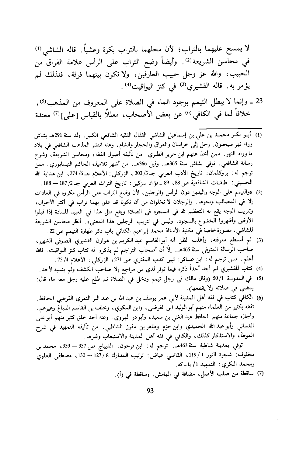(¬2) "والتيمم على الوجه واليدين دون الرأس والرجلين، لأن وضع التراب على الرأس مكروه في العادات إلا في المصائب ونحوها. والرجلان لا تخلوان من أن تكونا قد علق بهما تراب في أكثر الأحوال، وتتريب الوجه يقع به التعظيم لله في السجود في الصلاة ويقع مثل هذا في العبيد للسادة إذا قبلوا الأرض وأظهروا الخشوع بالسجود. وليس في تتريب الرجلين هذا المعنى". انظر محاسن الشريعة للشاشي، مصورة خاصة في مكتبة الأستاذ محمد إبراهيم الكتاني باب ذكر طهارة التيمم ص 22.