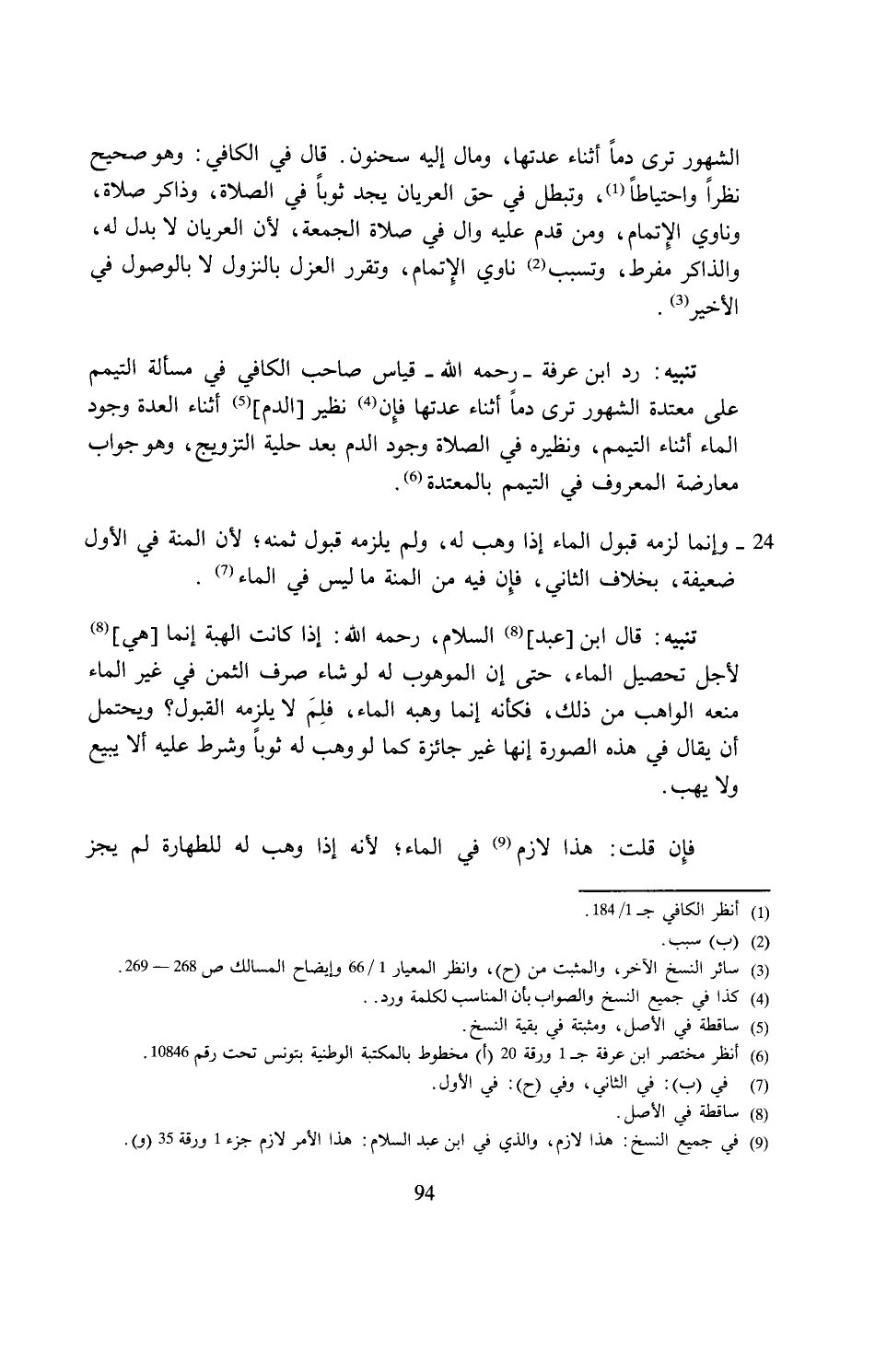 تنبيه: رد ابن عرفة -رحمه الله- قياس صاحب الكافي في مسألة التيمم على معتدة الشهور ترى دمًا أثناء عدتها فإِن (¬4) نظير [الدم] (¬5) أثناء العدة وجود الماء أثناء التيمم، ونظيره في الصلاة وجود الدم بعد حلية التزويج، وهو جواب معارضة المعروف في التيمم بالمعتدة (¬6).