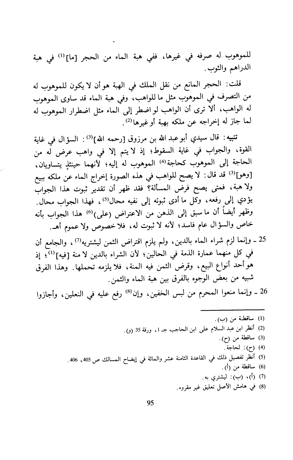تنبيه: قال سيدي أبو عبد الله بن مرزوق [رحمه الله] (¬3): السؤال في غاية القوة، والجواب في غاية السقوط؛ إذ لايتم إلا في واهب عرض له من الحاجة إلى الموهوب كحاجة (¬4) الموهوب له إليه؛ لأنهما حينئذٍ يتساويان، [وهو] (3) قد قال: لا يصح للواهب في هذه الصورة إخراج الماء عن ملكه ببيع ولا هبة، فمتى يصح فرض المسألة؟ فقد ظهر أن تقدير ثبوت هذا الجواب يؤدي إلى رفعه، وكل ما أدى ثبوته إلى نفيه محال (¬5)، فهذا الجواب محال. وظهر أيضًا أن ما سبق إلى الذهن من الاعتراض (على) (¬6) هذا الجواب بأنه خاص والسؤال عام فاسد؛ لأنه لا ثبوت له، فلا خصوص ولا عموم أهـ.