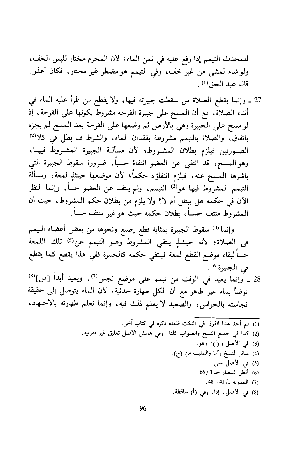 27 - وإنما يقطع الصلاة من سقطت جبيرته فيها، ولا يقطع من طرأ عليه الماء في أثناء الصلاة، مع أن المسح على جبيرة القرحة مشروط بكونها على القرحة، إذ لو مسح على الجبيرة وهي بالأرض ثم وضعها على القرحة بعد المسح لم يجزه باتفاق، والصلاة بالتيمم مشروطة بفقدان الماء، والشرط قد بطل في كلا (¬2) الصورتين فيلزم بطلان المشروط؛ لأن مسألة الجبيرة المشروط فيها، وهو المسح، قد انتفي عن العضو انتفاءً حسيًّا، ضرورة سقوط الجبيرة التي باشرها المسح عنه، فيلزم انتفاؤه حكمًا؛ لأن موضعها حينئذٍ لمعة، ومسألة التيمم المشروط فيها هو (¬3) التيمم، ولم ينتف عن العضو حسًا، وإنما النظر الآن في حكمه هل يبطل أم لا؟ ولا يلزم من بطلان حكم المشروط، حيث أن المشروط منتف حسًا، بطلان حكمه حيث هو غير منتف حسًا.