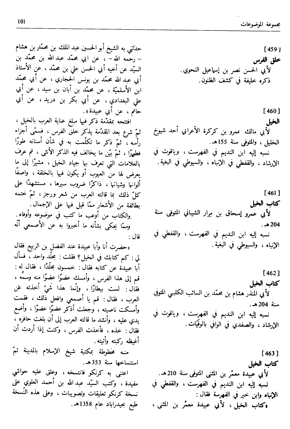 [462] كتاب الخيل لأبي المنذر هشام بن محمّد بن السائب الكلبي المتوفى سنة 204 ه.