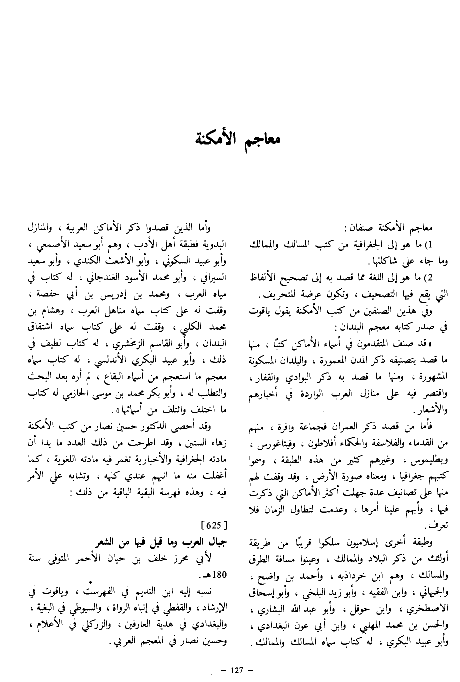 «قد صنف المتقدمون في أسماء الأماكن كتبا، منها ما قصد بتصنيفه ذكر المدن المعمورة، والبلدان المسكونة المشهورة، ومنها ما قصد به ذكر البوادي والقفار، واقتصر فيه على منازل العرب الواردة في أخبارهم والأشعار.