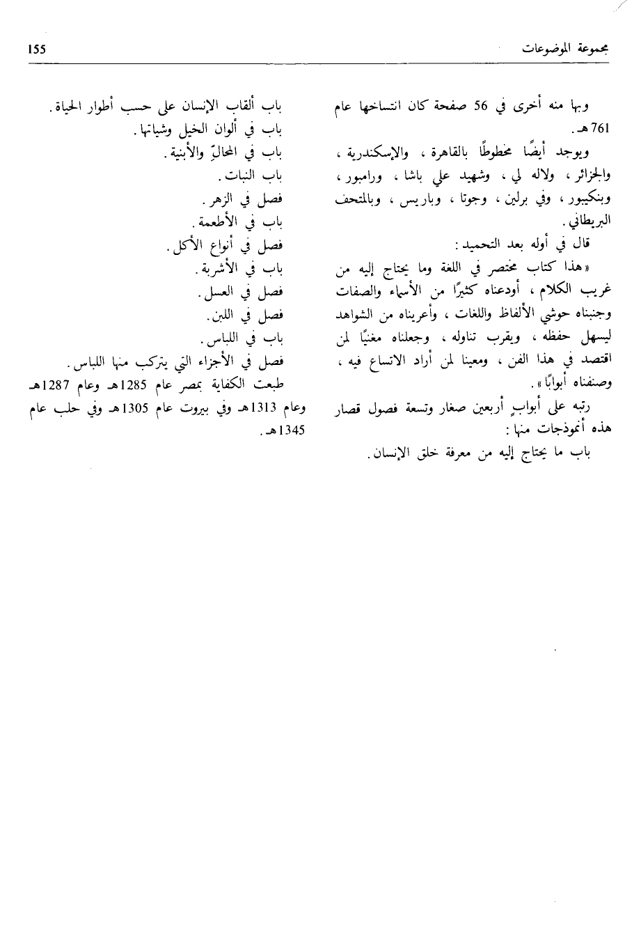«هذا كتاب مختصر في اللغة وما يحتاج إليه من غريب الكلام، أودعناه كثيرا من الأسماء والصفات وجنبناه حوشي الألفاظ واللغات، وأعريناه من الشواهد ليسهل حفظه، ويقرب تناوله، وجعلناه مغنيا لمن اقتصد في هذا الفن، ومعينا لمن أراد الاتساع فيه، وصنفناه أبوابا».