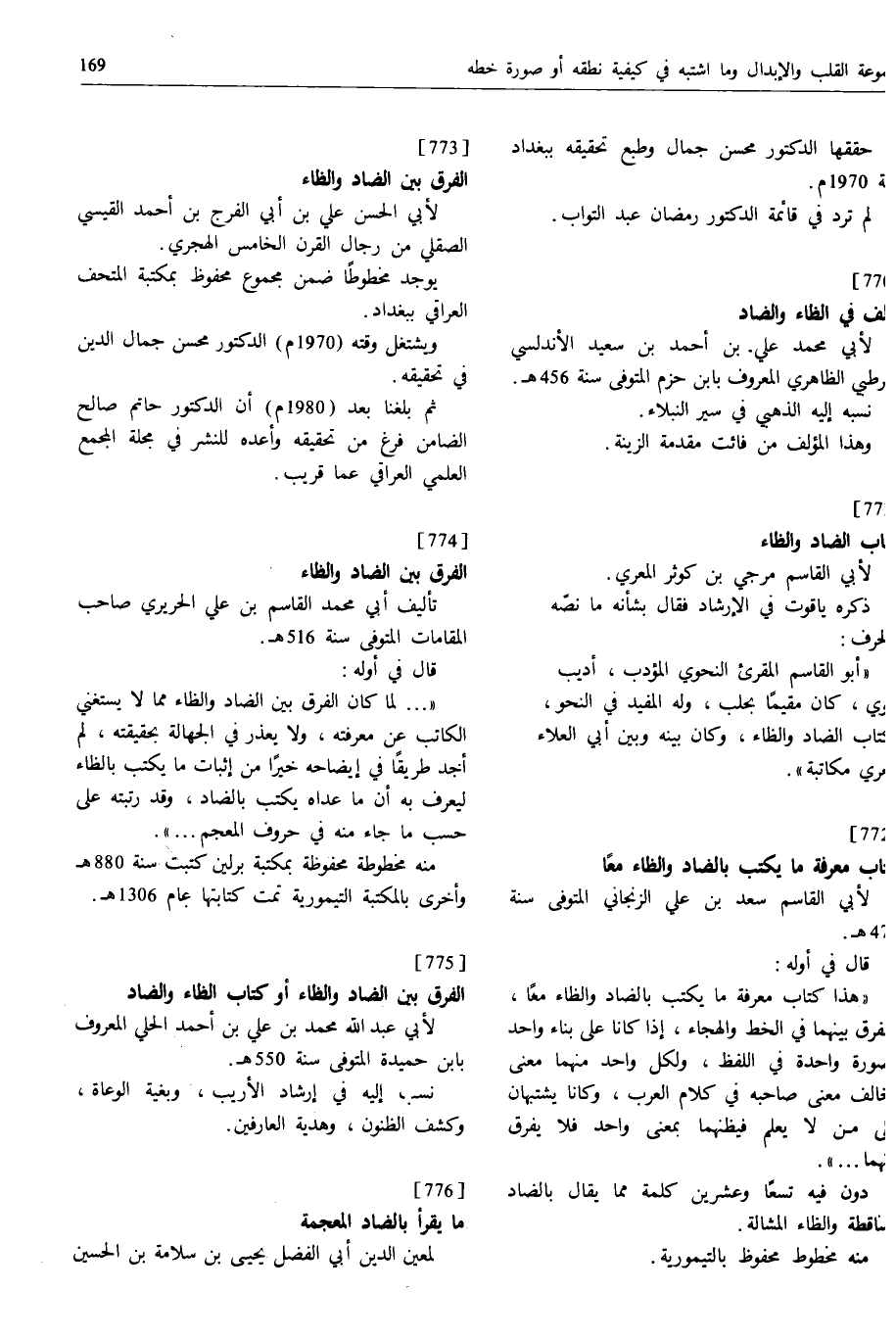 [775] الفرق بين الضاد والظاء أو كتاب الظاء والضاد لأبي عبد اللّه محمد بن علي بن أحمد الحلي المعروف بابن حميدة المتوفى سنة 550 ه.