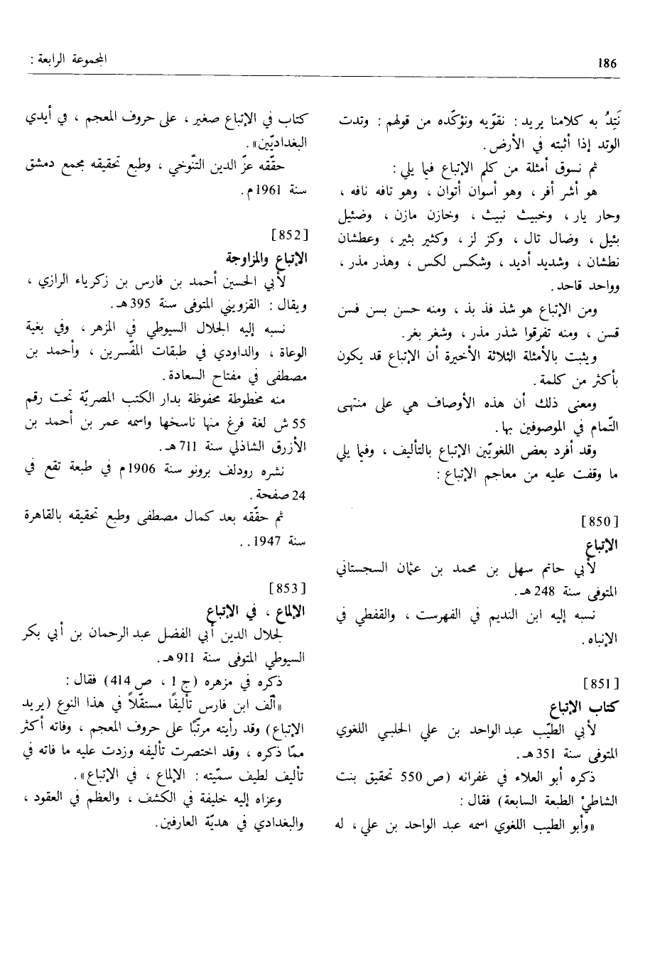 [851] كتاب الإتباع لأبي الطيّب عبد الواحد بن علي الحلبي اللغوي المتوفى سنة 351 ه.