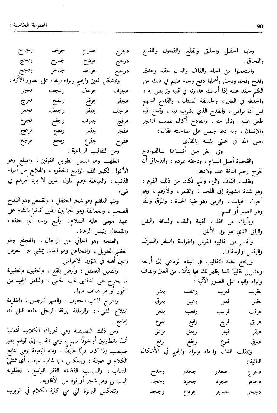 ويرتفع عدد التقاليب في البناء الرباعي إلى أربعة وعشرين تقليبا كما يظهر لك فيما يتألف من العين والقاف والراء والباء على الصور الآتية: