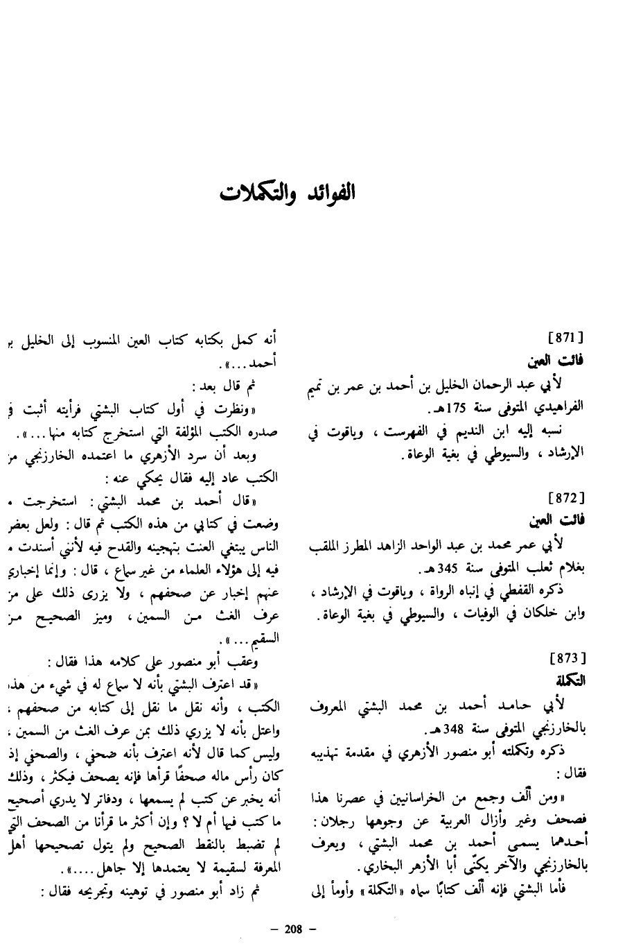 [871] فائت العين لأبي عبد الرحمان الخليل بن أحمد بن عمر بن تميم الفراهيدي المتوفى سنة 175 ه.