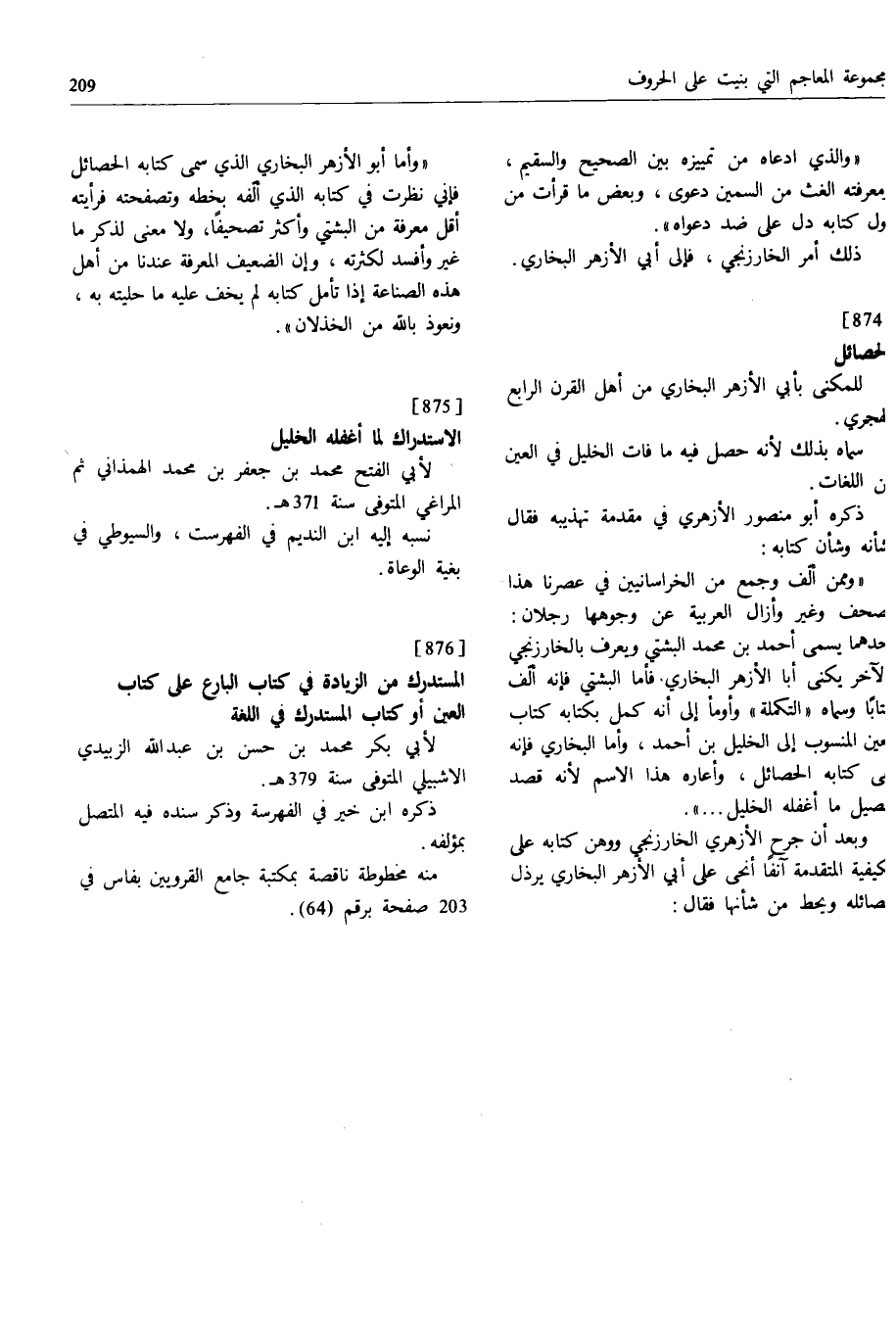 أحدهما يسمى أحمد بن محمد البشتي ويعرف بالخارزنجي والآخر يكنى أبا الأزهر البخاري فأما البشتي فإنه ألّف كتابا وسماه «التكملة» وأومأ إلى أنه كمل بكتابه كتاب العين المنسوب إلى الخليل بن أحمد، وأما البخاري فإنه سمى كتابه الحصائل، وأعاره هذا الاسم لأنه قصد تحصيل ما أغفله الخليل ... ».