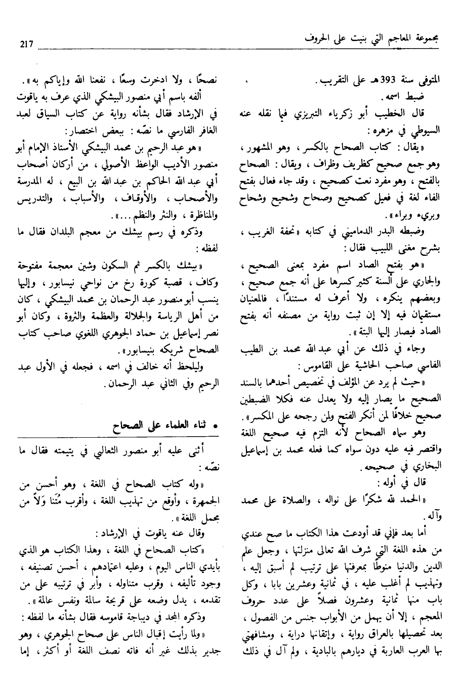 «وله كتاب الصحاح في اللغة، وهو أحسن من الجمهرة، وأوقع من تهذيب اللغة، وأقرب متناولا من مجمل اللغة».