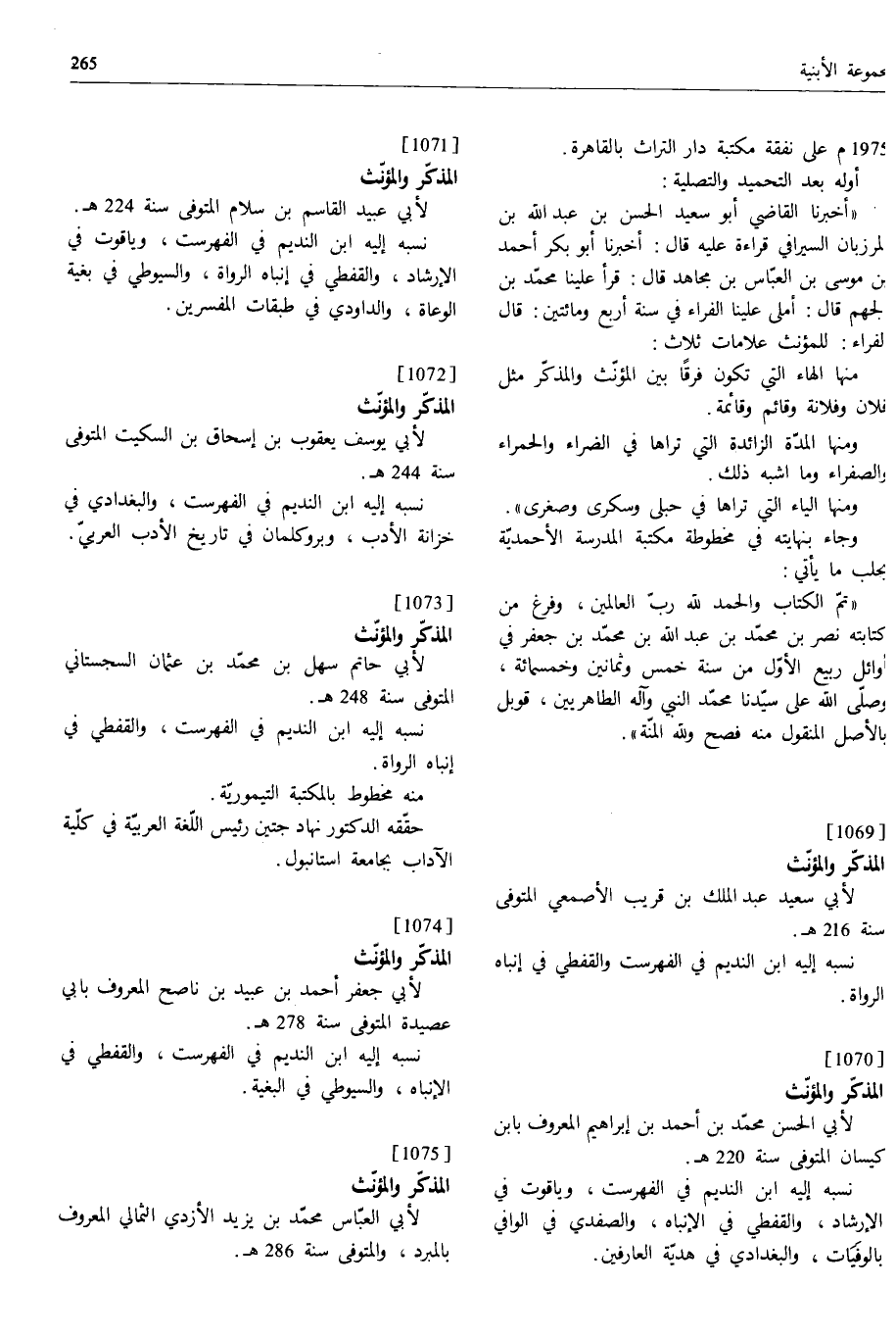 [1075] المذكّر والمؤنّث لأبي العبّاس محمّد بن يزيد الأزدي الثمالي المعروف بالمبرد، والمتوفى سنة 286 ه.