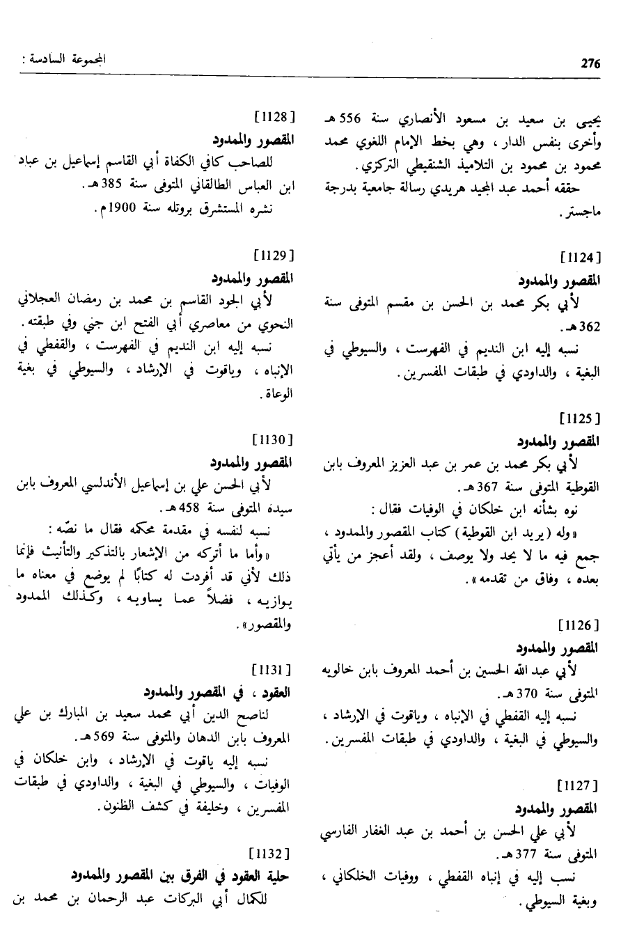 [1131] العقود، في المقصور والممدود لناصح الدين أبي محمد سعيد بن المبارك بن علي المعروف بابن الدهان والمتوفى سنة 569 ه.