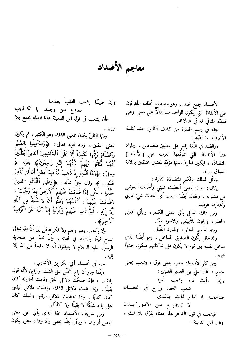 «والضد في اللّغة يقع على معنيين متضادين، والمراد هنا الألفاظ التي توقّعها العرب على [الألفاظ] المتضادّة، فيكون الحرف منها مؤدّيا لمعنيين مختلفين بدلالة السياق ... ».