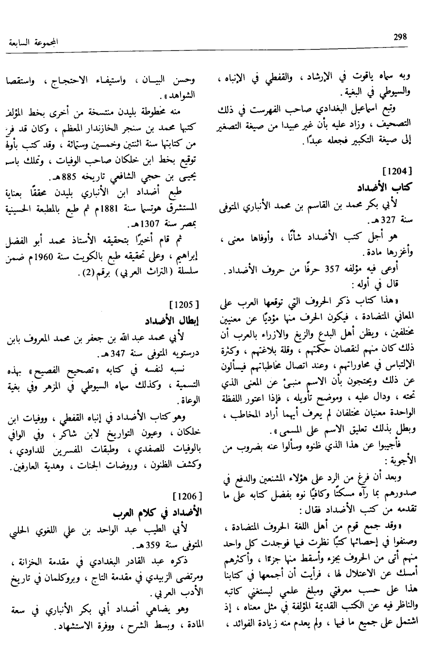 [1205] إبطال الأضداد لأبي محمد عبد اللّه بن جعفر بن محمد المعروف بابن درستويه المتوفى سنة 347 ه.